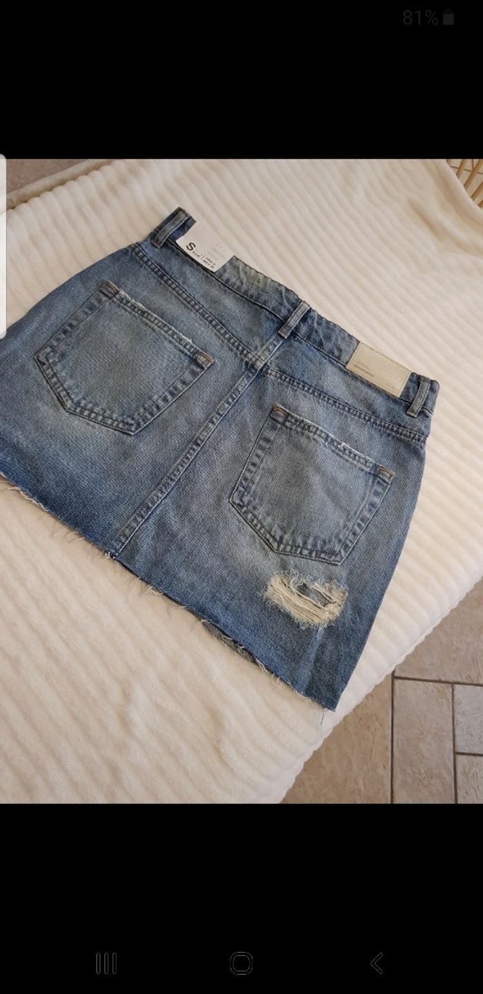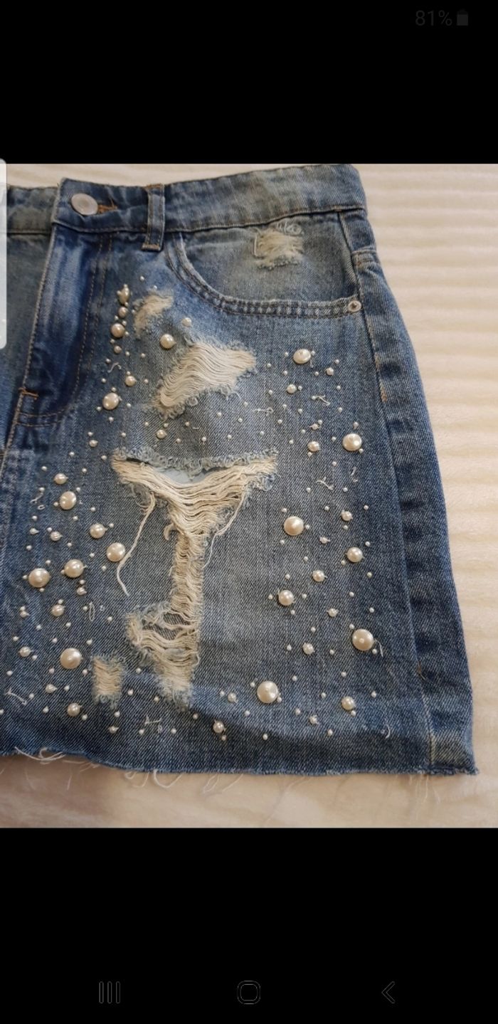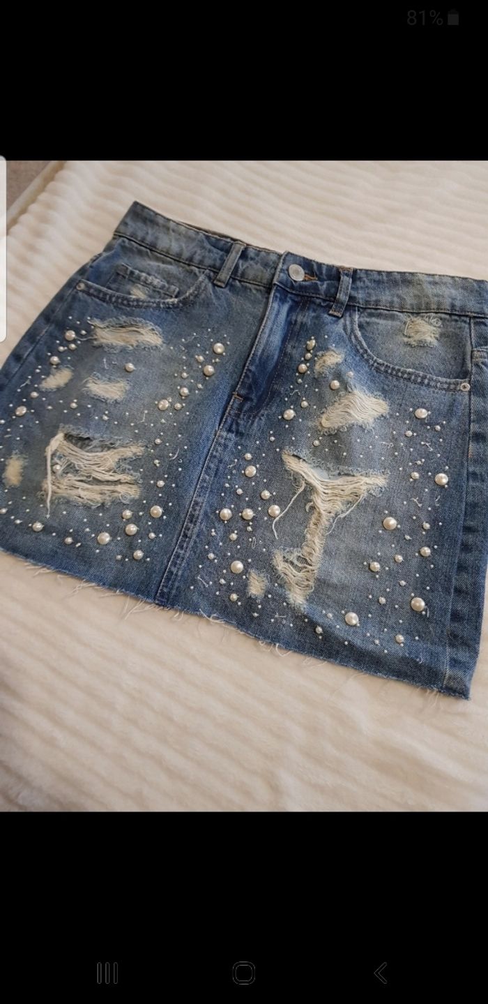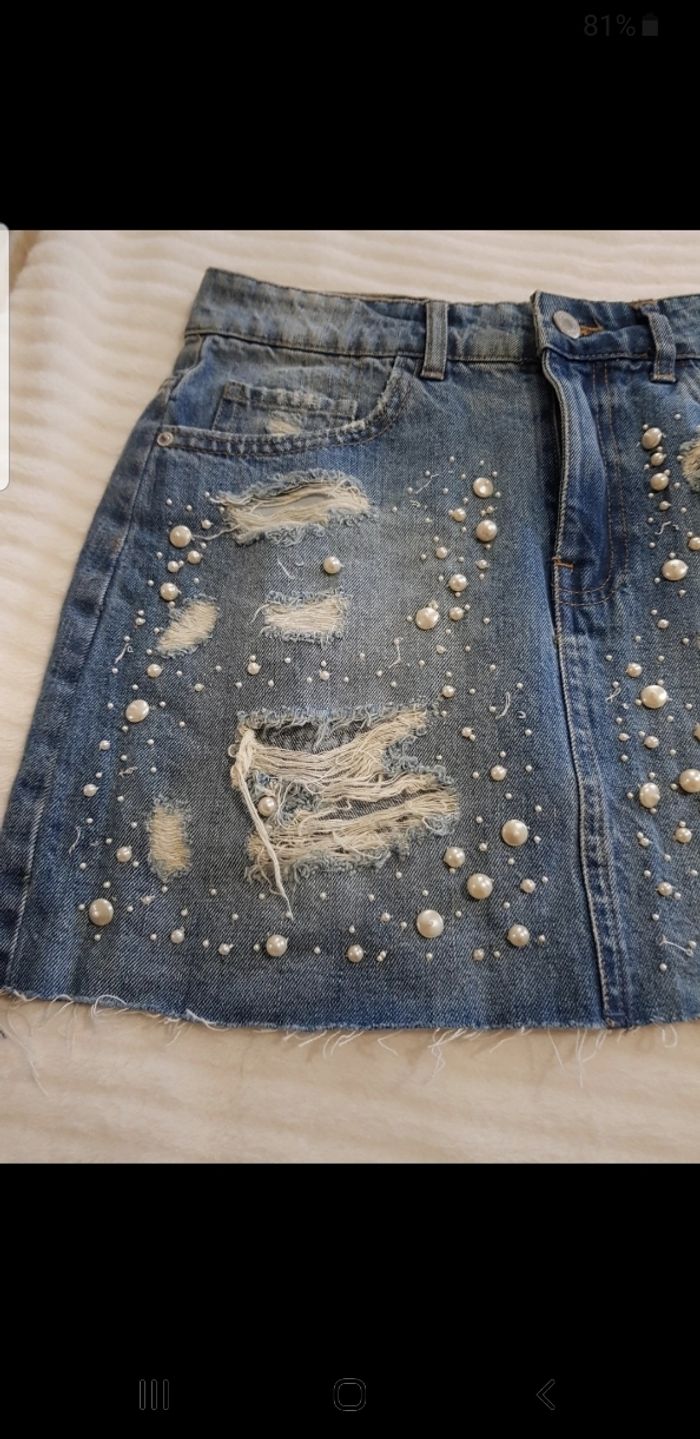 Jupe en jean avec strass sur le devant et effet déchiré. Zippée à l avant. Neuve, jamais portée, encore l etiquette