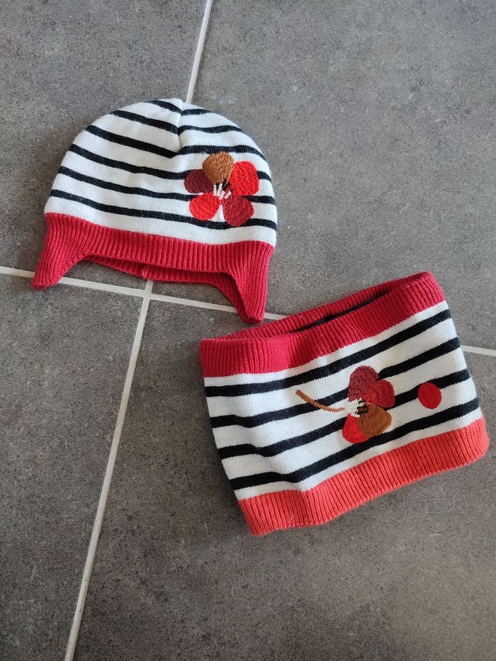 Parfait état Bonnet : 44cm soit 6/9 mois Cache cou : T0 soit 1/18 mois