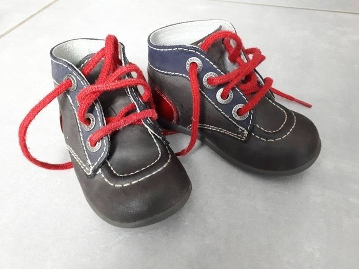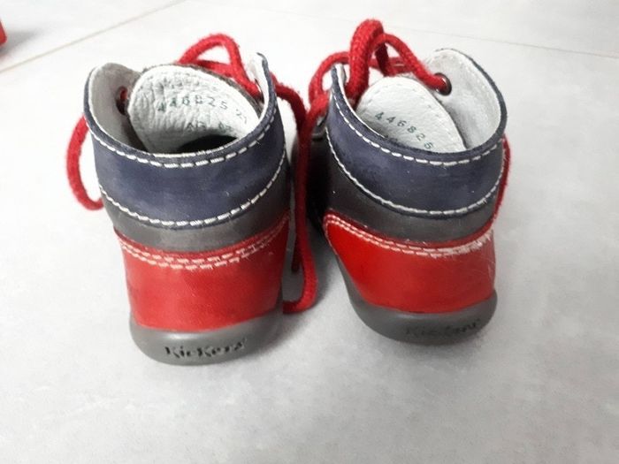 je vends cette paire de bottillons/ chaussures montantes pointure 21 de marque KICKERS catégorie Bonbon à lacets 100% cuir semelle en caoutchouc bleu marine, gris foncé et rouge TRES BON ETAT