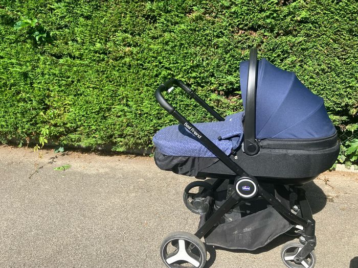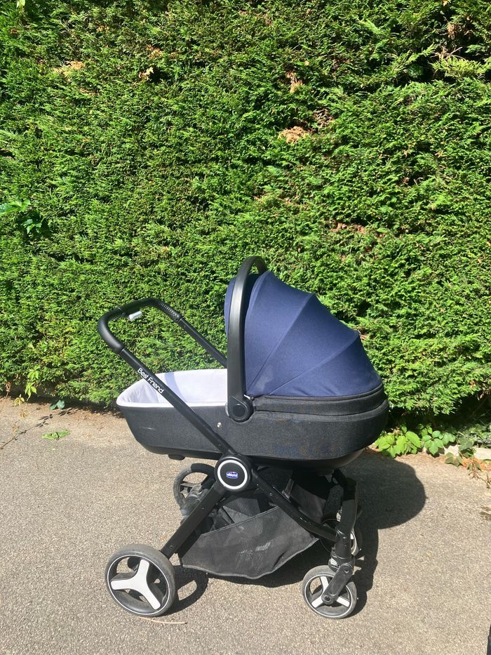 Poussette trio marque Chico d occasion , bon etat. ( couffin siège auto et assise poussette) à récupérer sur place.