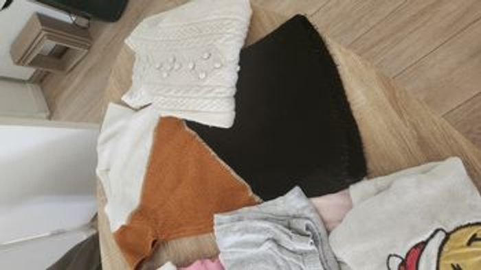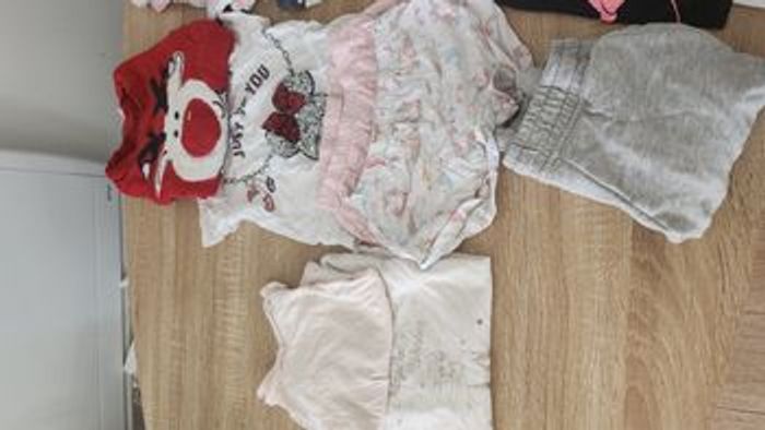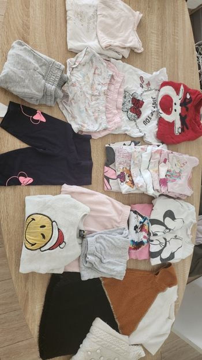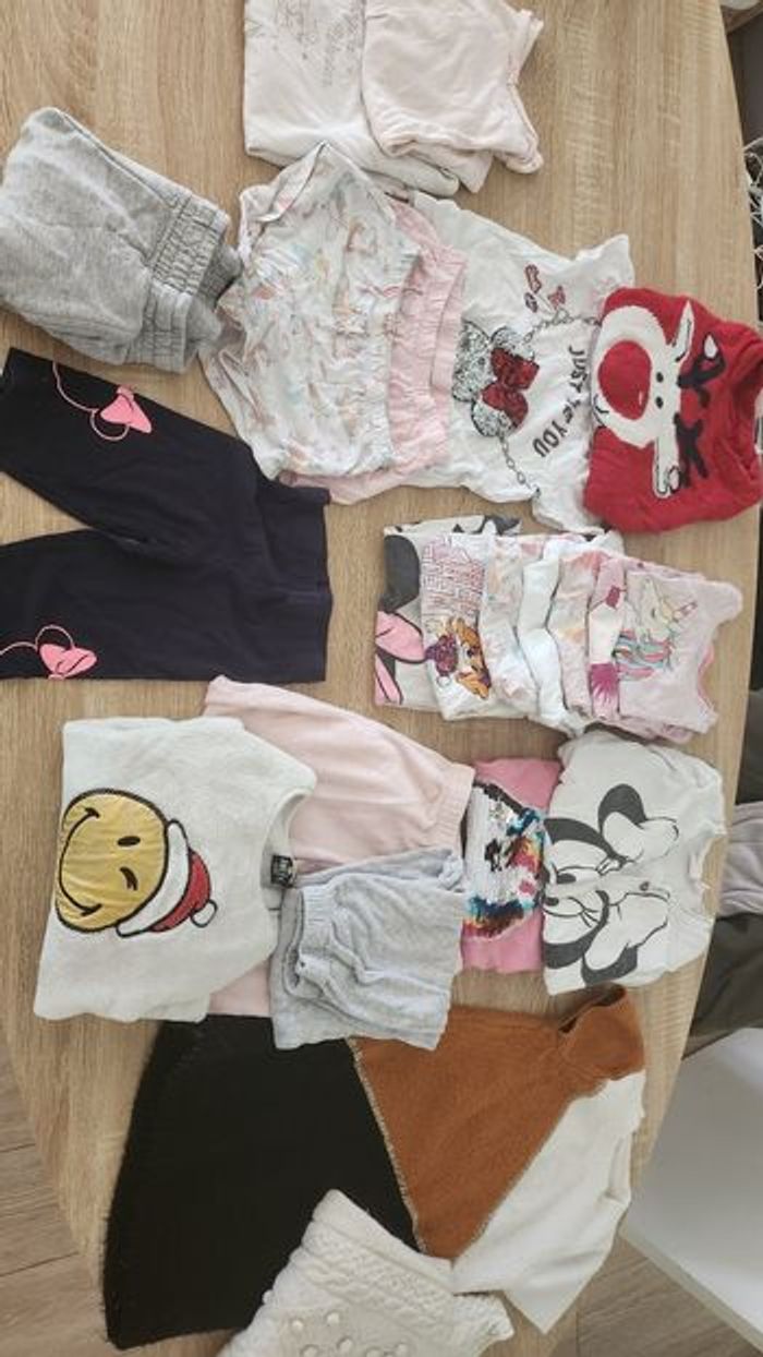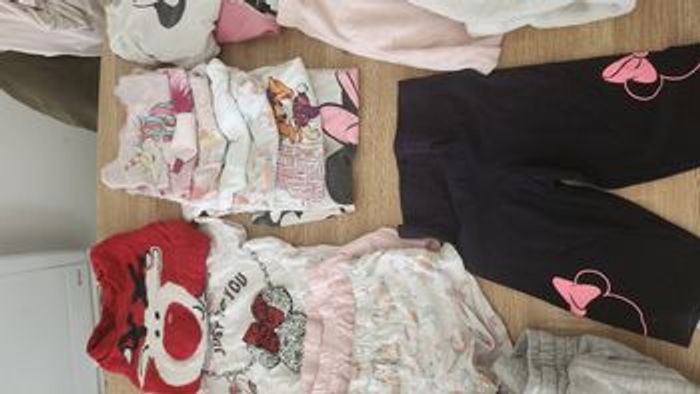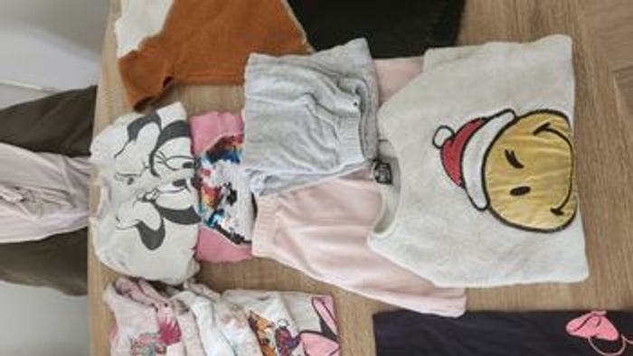Multi marque et quelque licorne 3 haut manche longue 2 short 8 t shirt 1 pull cerf 2 robe pull 1 legg 1 pull smiley 2 bas de pyjama 1 gilet minie 1 jogg Porte en bonne état 22 articles