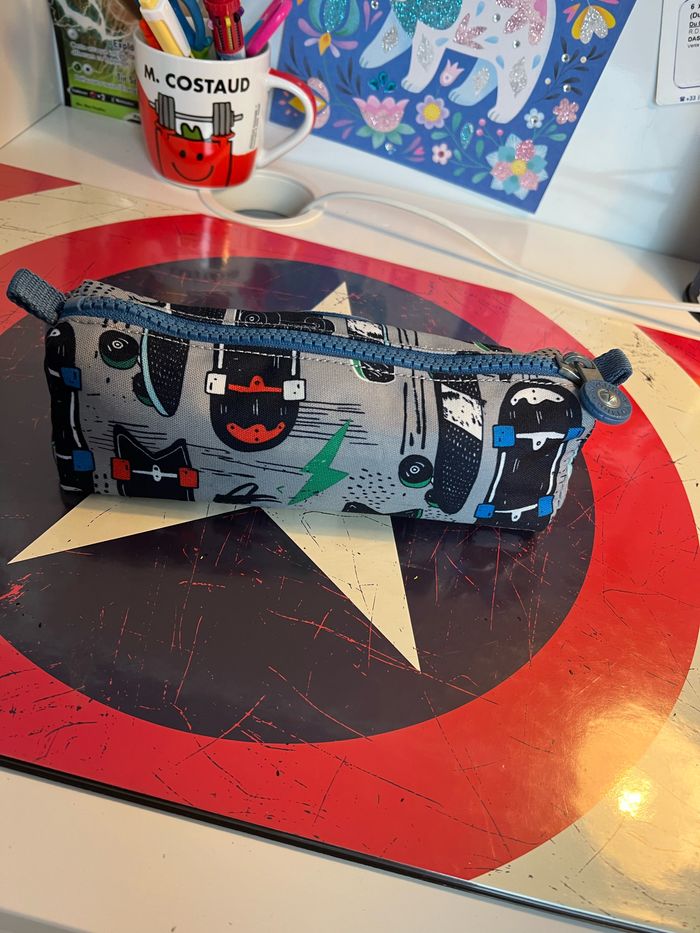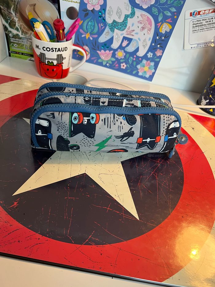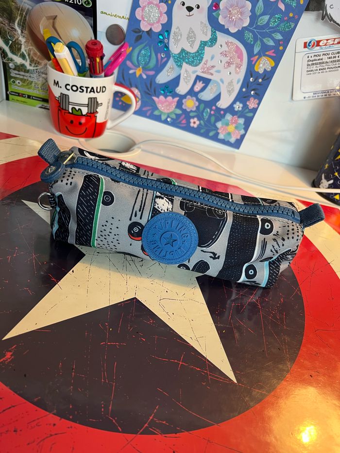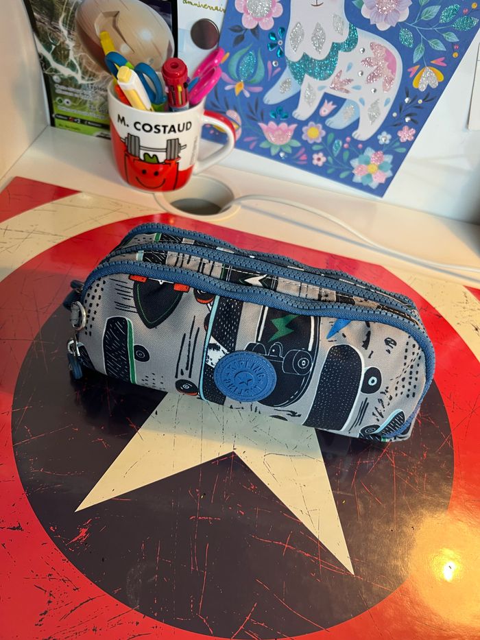 Trousses Kipling en très bon état. Une trousse simple. Une trousse avec 3 compartiments de rangement pour crayons de couleurs et feutres.