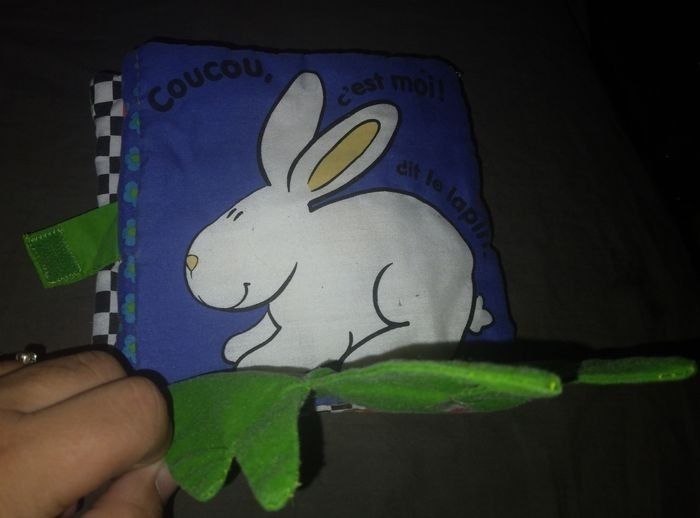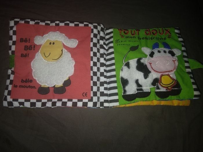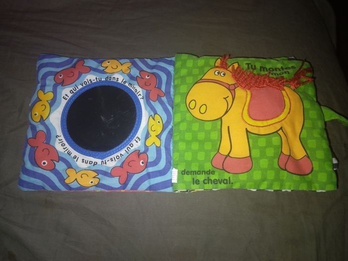 Livre en tissu Photos des différentes pages Le miroir est un peu rayé (voir photos) Différentes matières sur les animaux pour développer le touche de votre petit amour A été laver Maison non-fumeur sans animaux Les réductions sont activés