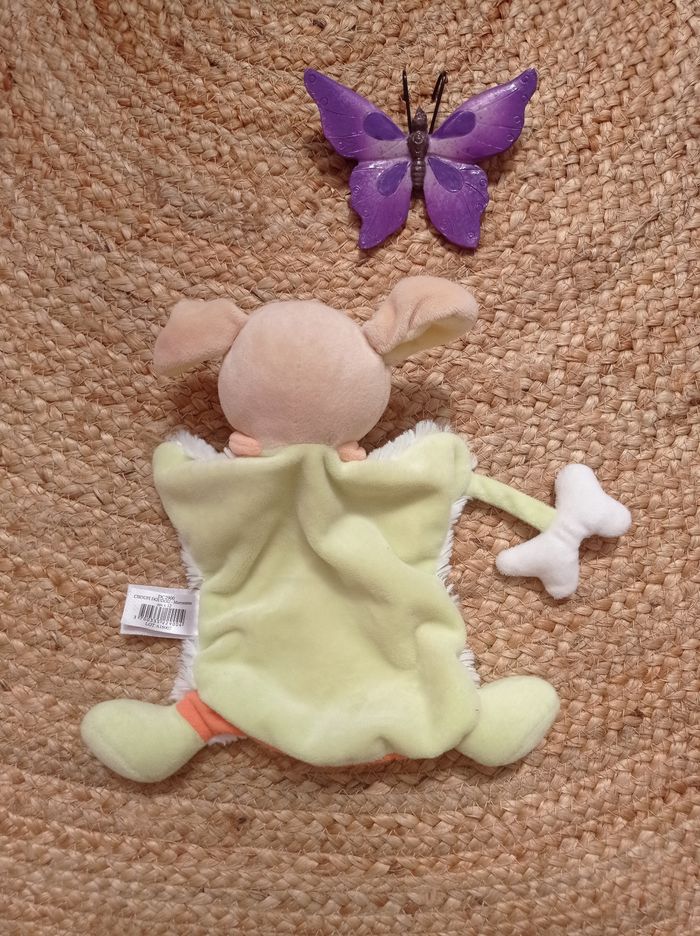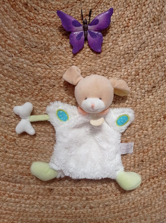 Doudou et compagnie Marionnette Chien choupi Beige blanc vert Os #douceur_doudouetcompagnie C19