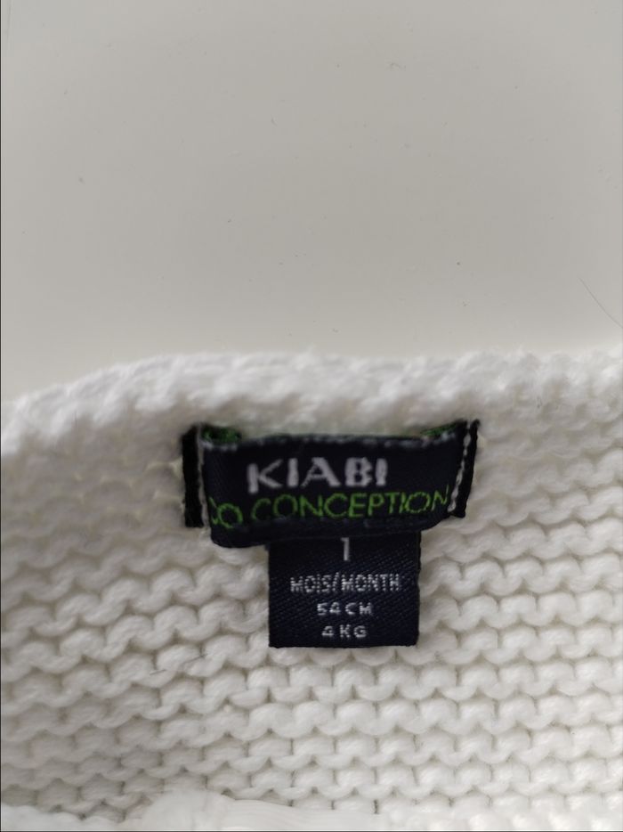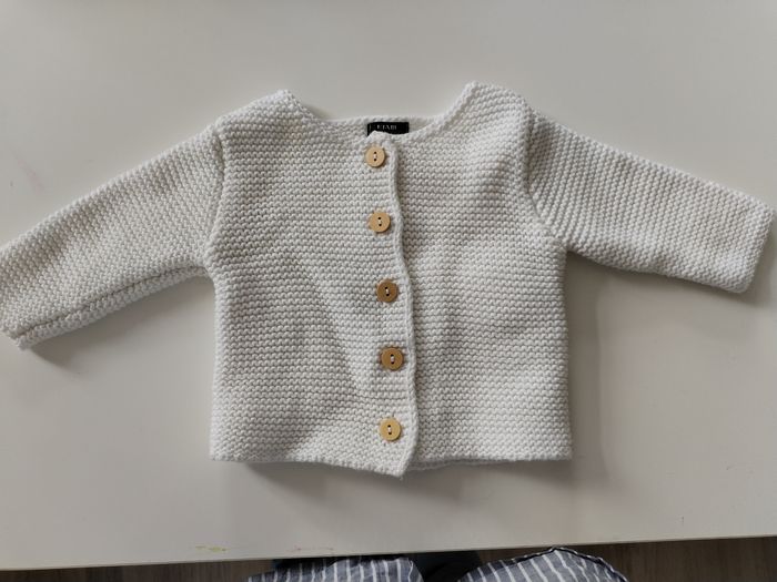 Gilet en laine taille 1 mois Marque Kiabi Je le met en bon état car il y a juste une petite trace jaune sur le haut du gilet, elle ne se voit pratiquement pas.