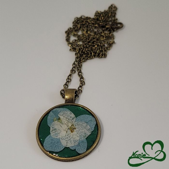 Sautoir doré, en acier inoxydable couleur bronze et en resine, avec des fleurs séchées - photo numéro 1
