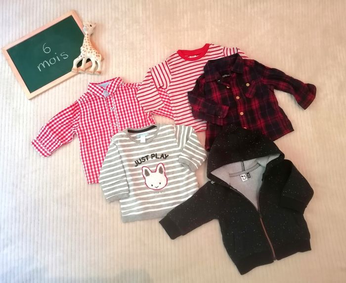 💫 Vends lot en 6 mois 💫 2 chemises à carreaux 1 tee shirt manches longues à rayures 1 pull lapin à rayures 🐰 Et 1 gilet à capuche La réduction sur les lots est activée, n'hésitez pas à jeter un coup d'œil sur le Dressing ✨ 🏠 Maison de non fumeurs 🏡