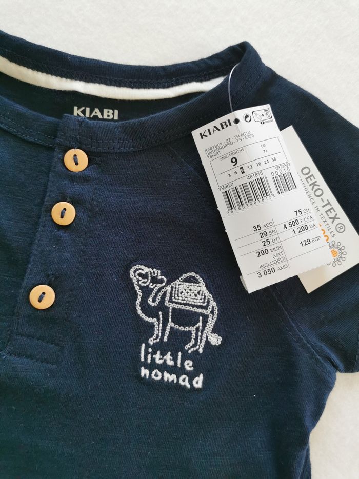 Tee-shirt 👕 bleu marine 👶 Kiabi Taille 9 Mois - 69/72 cm • Matière: 100% coton • Col tunisien • Manches courtes • Dromadaire 🐪 sur la poitrine • Couleur: bleu marine 🟦 Parfait état👌, avec étiquette🏷️, jamais porté 🌫