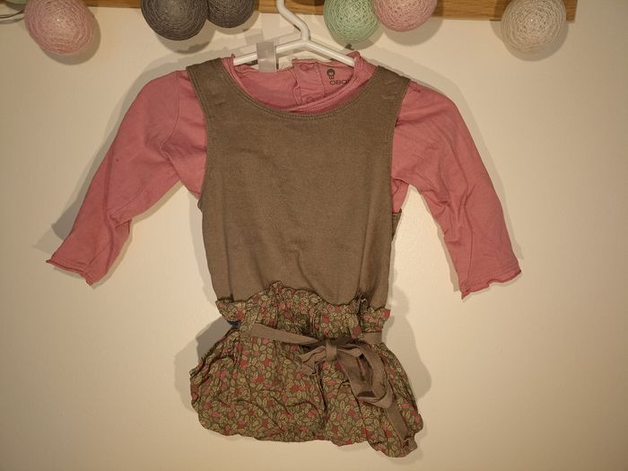 Ensemble composé de 1 robe kaki ceinturée, bas imprimé feuilles rouges, roses, marrons 1 haut à manches longues en coton bio, couleur vieux rose