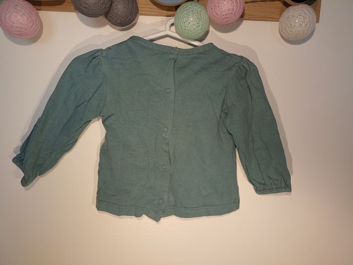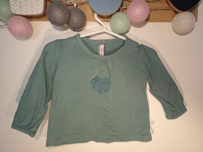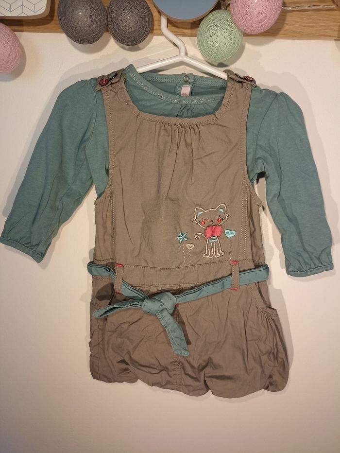 Ensemble composé de 1 robe grise type salopette ceinturée, broderie chat 1 haut à manches longues bleu vert avec coeur pailleté, fermeture par pressions dans le dos