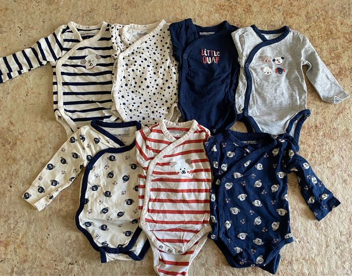 Lot de 7 bodies manches longues 1 mois - 54 cm Orchestra Très peu porté Maison non fumeur Remise activée sur les lots Envoi rapide et soigné