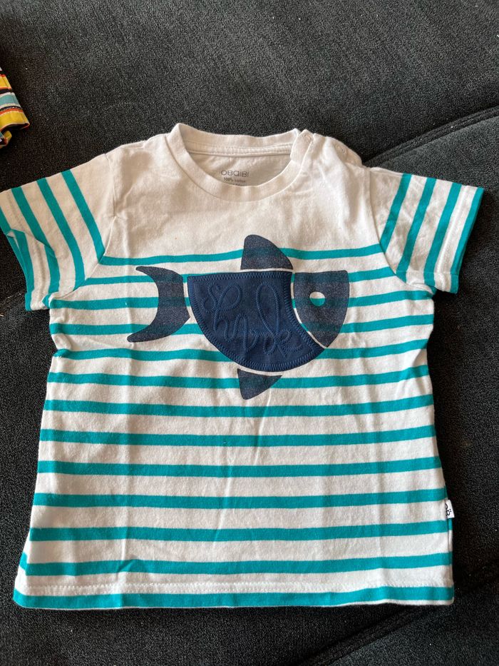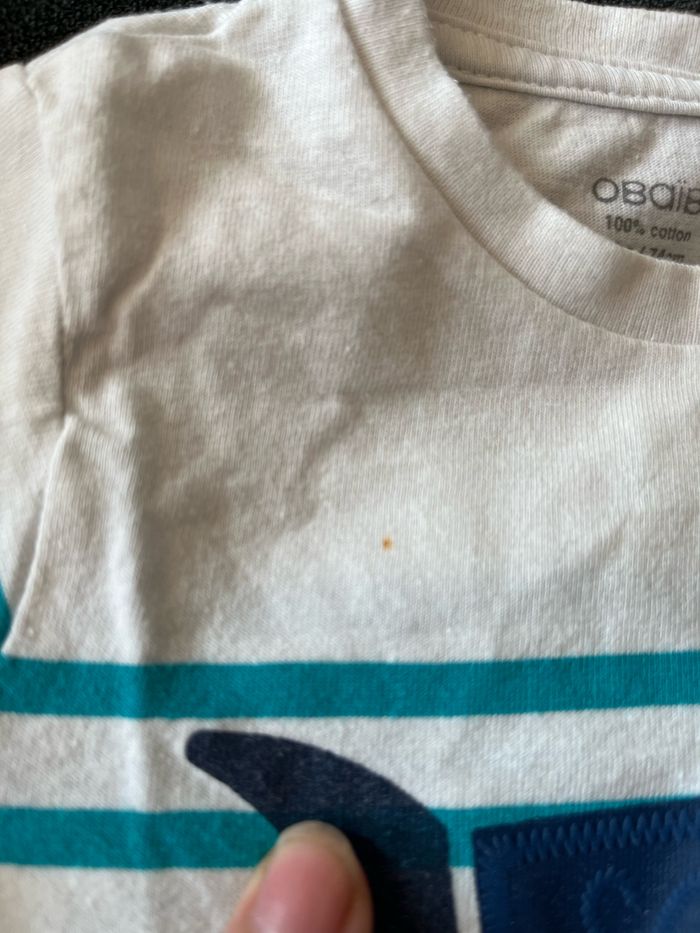 T-shirt bébé garçon bon état général mais petite tâche sur le devant (voir photo 3) je ne sais pas si elle partira au lavage ou non Marque Obaïbi Taille 12 mois - 74cm