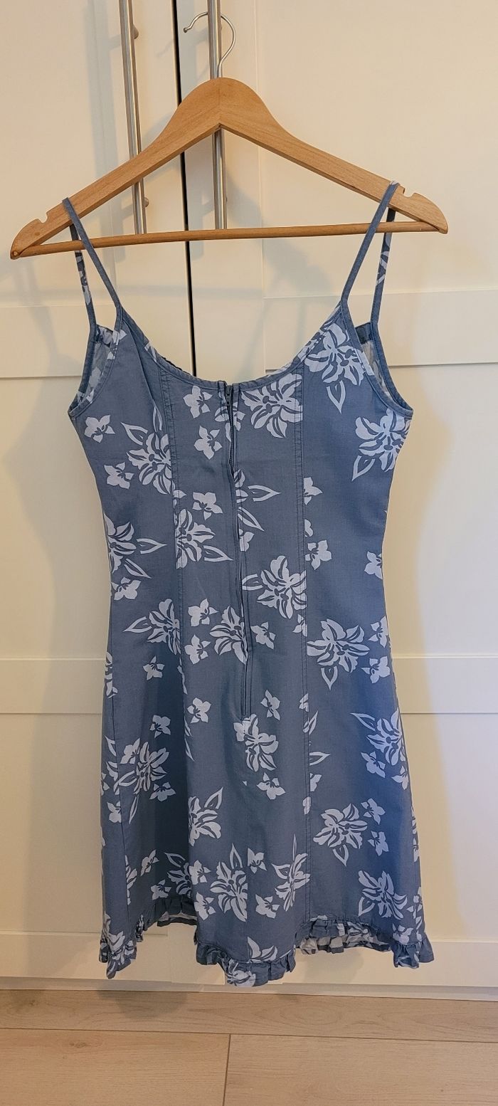 Robe JENNYFER à fines bretelles, bleue motif fleurs hawaïennes, zippée au dos, longueur 90 cm. Taille 34. Étiquette coupée. En TRÈS BON ÉTAT (très peu portée).