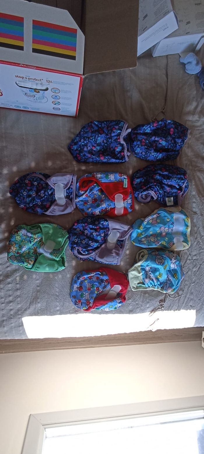 Lot de 10 couches lavables TE2 neuves (dès neuf mois jusqu’à la propreté) 15 inserts jamais utilisés Lot de 4 boîtes de feuillets de protections neuves Donne en plus une boîte de feuillet ayant été ouverte