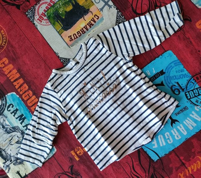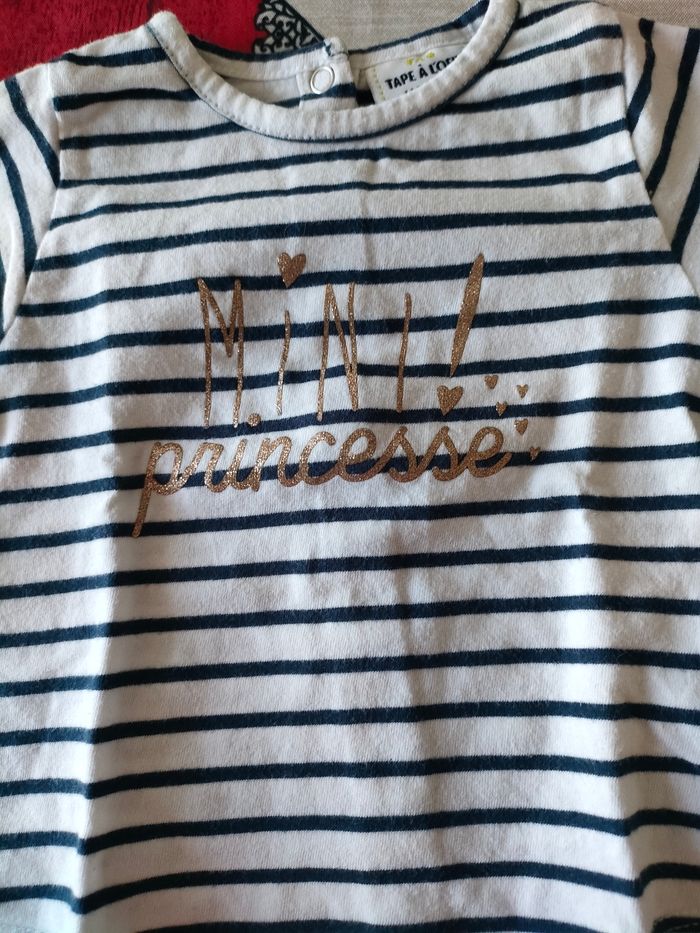 😻 Tee shirt bébé fille 😻 Manches longues 😻 Style marinière 😻 Thème "Mini princesse" pailleté 😻 Marque Tape à l'oeil 😻 Taille 6 mois 😻 Très bon état