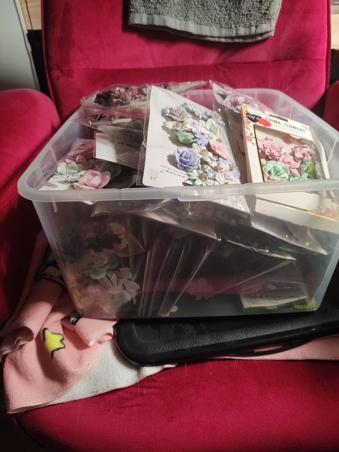 Lot de scrapbooking comprenant plus de 300 papiers, plus ce qu'il y a sur les photos. Je n'ai pas pu tout prendre en photo. Il faut savoir que le lot pèse très lourd donc il ne sera pas possible de faire de livraison.