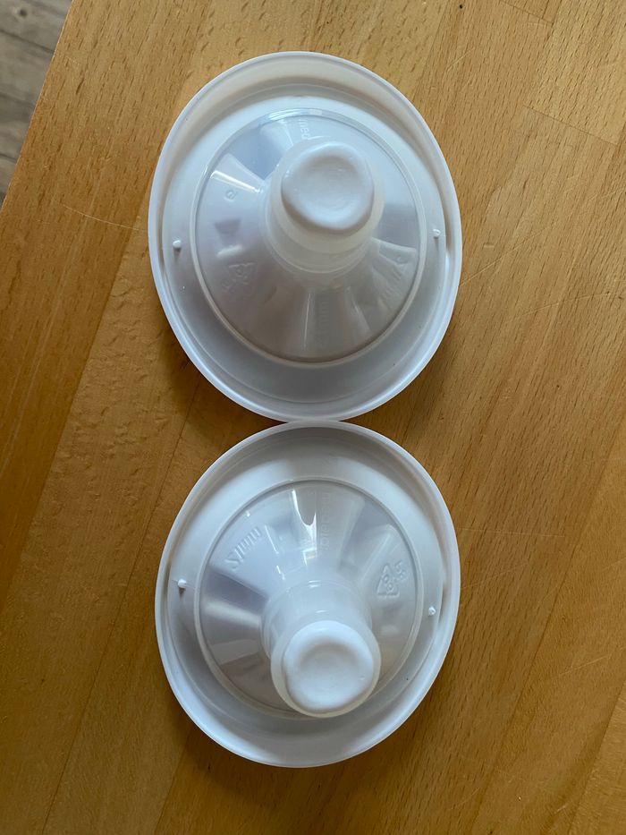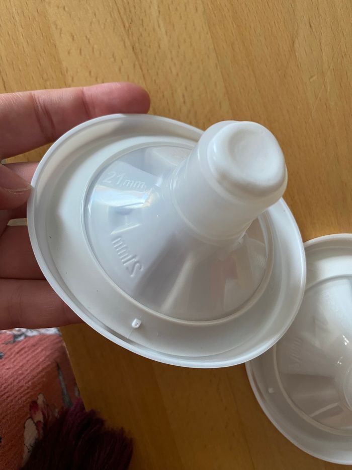 Téterelle neuve taille 21 mm. Prix neuf 12 euros 2 biberons sans tétine car utiliser uniquement pour tirer le lait. Prix neuf 14 euros 4 capuchons.