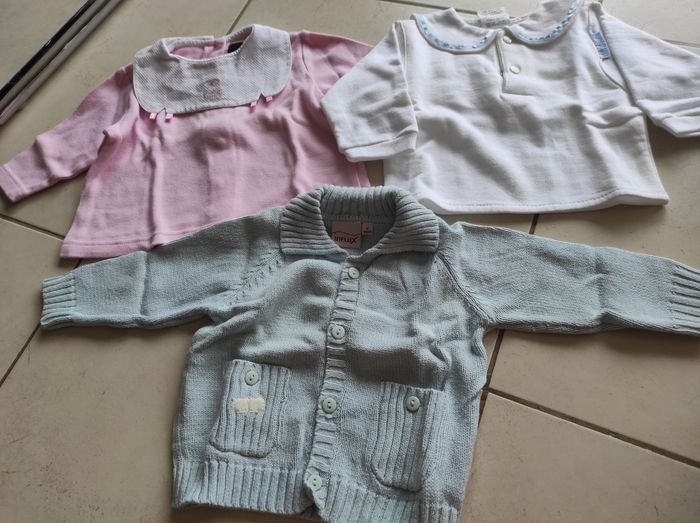 Lot de 3 articles 1 tee shirt Rose col et boutons ds le dos DPAM 1 sweat blanc col et bouton devant Tim pouce 1 gilet bleu clair boutons devant influx Tous en très bon état en 6 mois