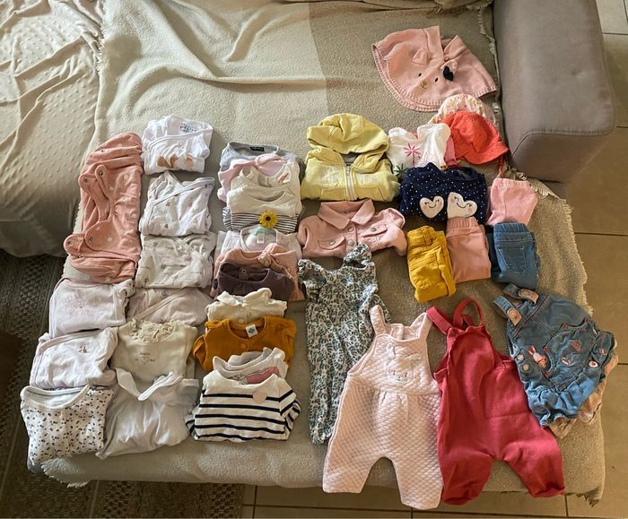 Lot de vêtements filles 3 mois en très bon état 9 bodies 10 hauts dont gilets 2 vestes 3 salopettes 1 robe 1 gigoteuse 3/6 mois 4 pantalons 1 poncho 2 pyjamas (1 été et 1 hivers)
