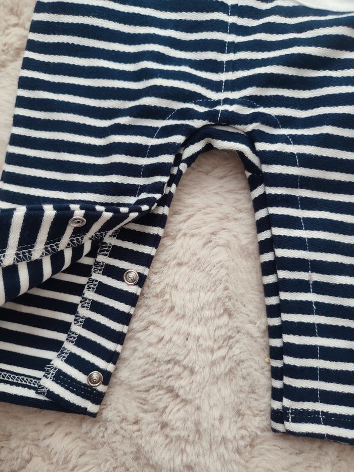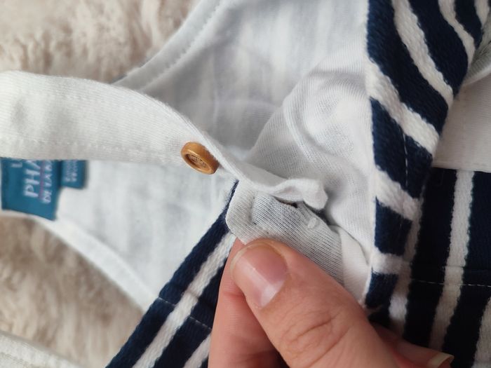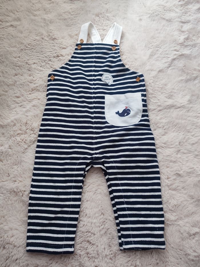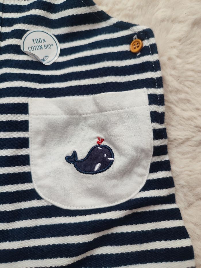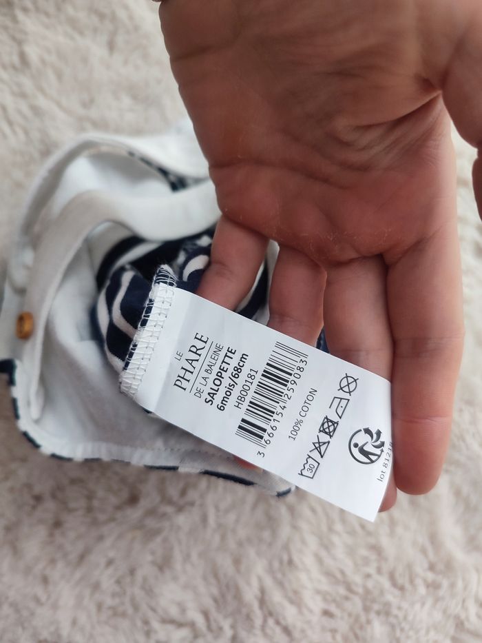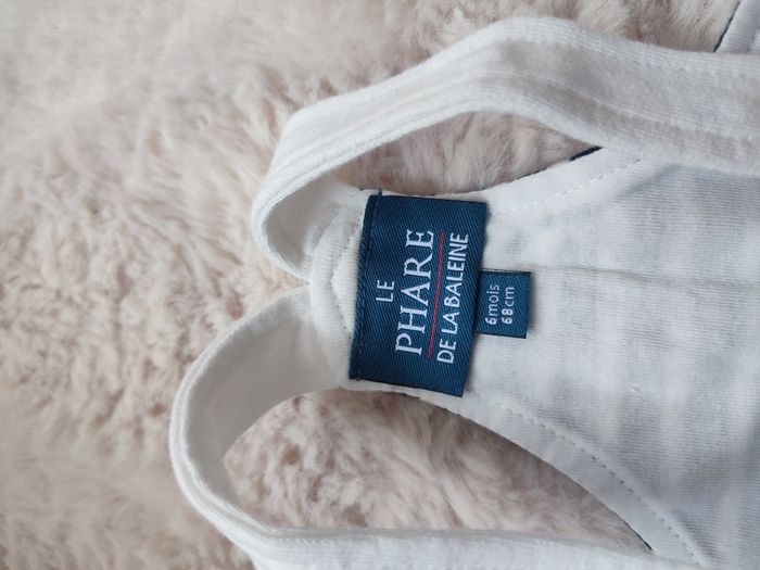 Bonjour. Je vends cette salopette neuve dans étiquette. Rayée bleue et blanche. Marque le phare de la baleine. Taille 6 mois pour 68cm. Boutons pressions.