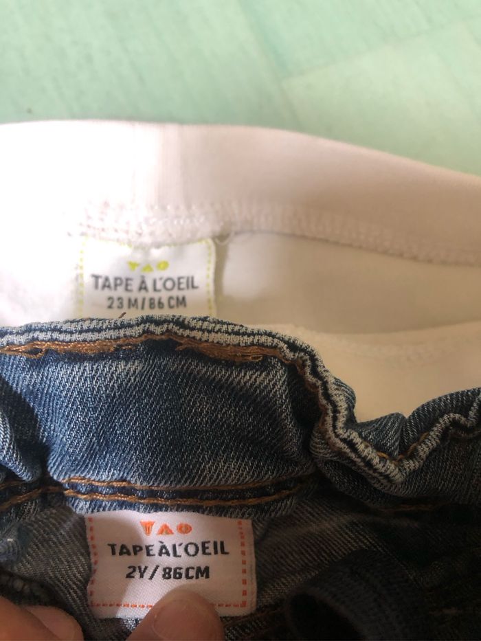 Jupe et legging « tape à l’œil » Jupe: 2 ans (86cm) qui peut-être resserré à la ceinture Legging: 23 mois (86cm) blanc