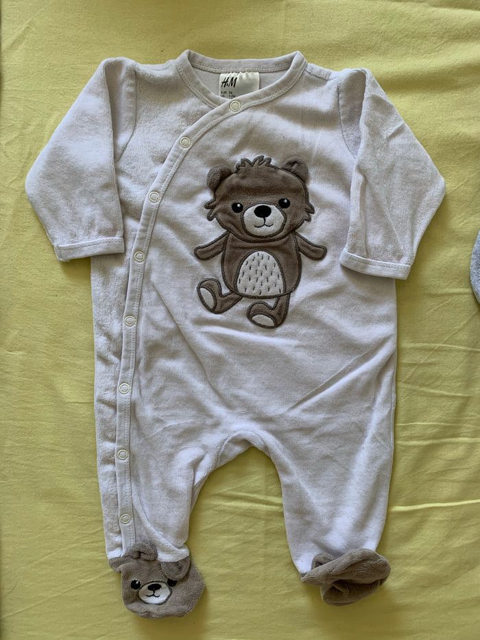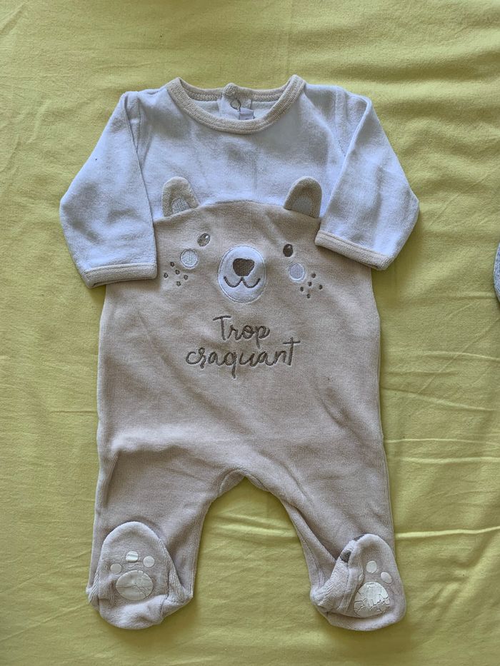 Deux pyjamas de couleur beige taille 1 mois Un pyjama es de marques H&M et l’autre GEMO En bon état