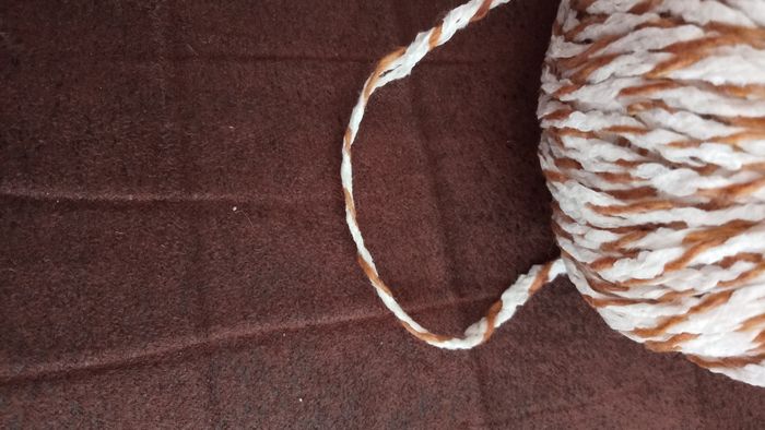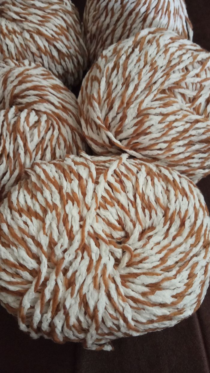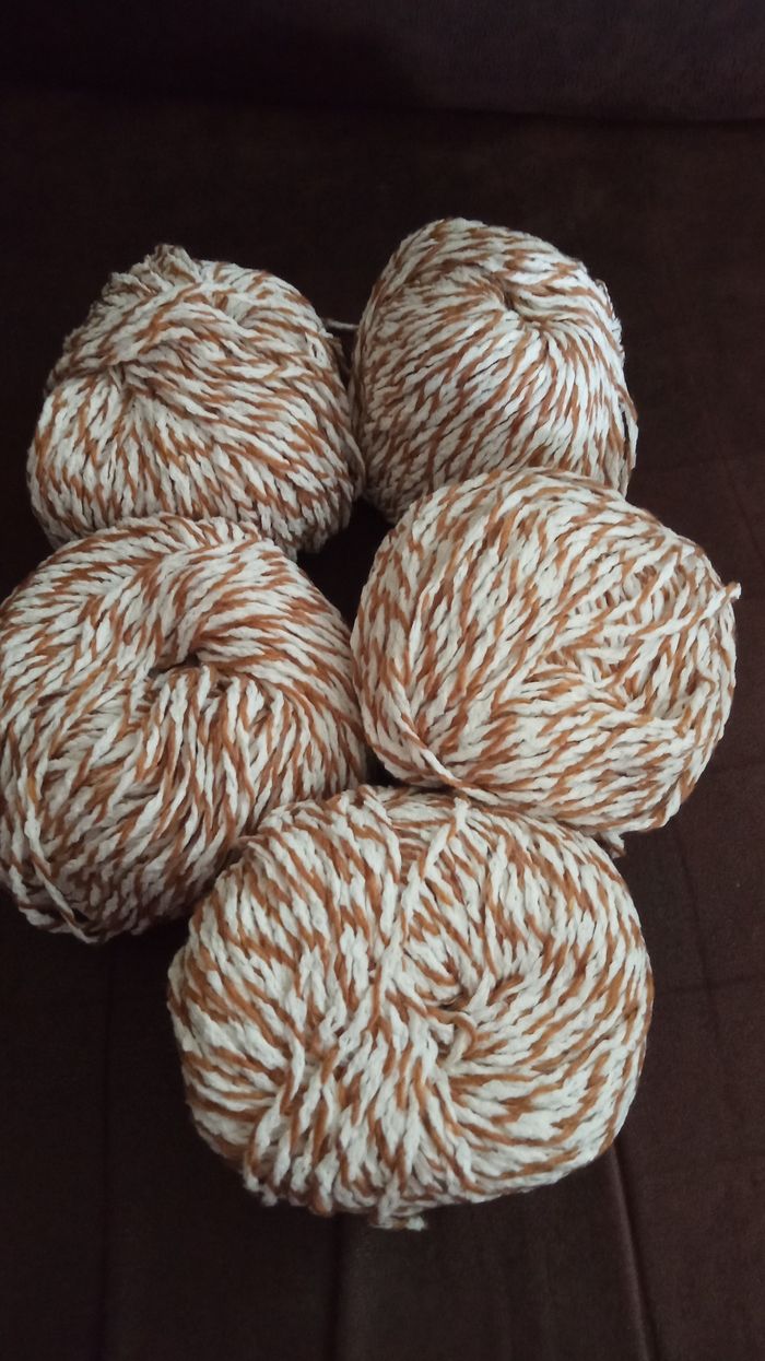 Lot de 5 Pelotes Fantaisie chinées Couleur: Blanc et Marron Matière: 30% Acrylique + 70% Coton 5 pelotes de 50g chacune environ, +/- 75m chacune Aiguilles ou Crochet N°4,5-5 Lot Neuf