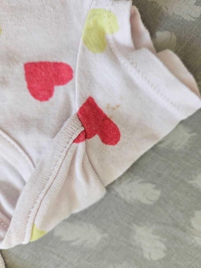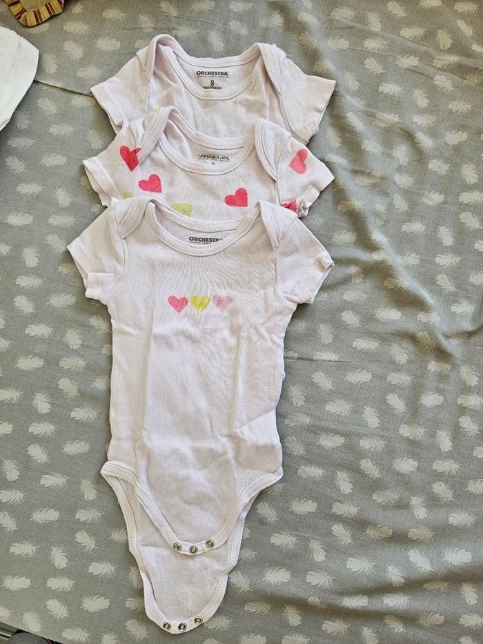 Lot de bodys manches courtes quelques micro tâches mais sinon ils sont en très bon état .. Ils apparaissent blanc sur les photos mais ils sont rose pâle Taille 9 mois