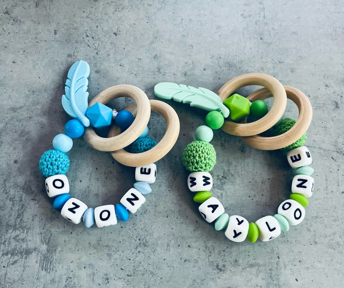 Hochet personnalisé en silicone ou en bois au souhait de l’acheteur . Personnalisable au choix de l’acheteur que ce soit la couleur comme le prénom ou le thème . Le fil est doublé pour plus de sécurité tout le long de l’attache tétine. N’hésitez pas à me demander et regarder mon dressing. Une photo vous sera envoyée avant l’expédition pour vous ayez un aperçu du rendu. Tous les produits sont réalisés avec du materiel spécial conçu aux bébés , enfants.