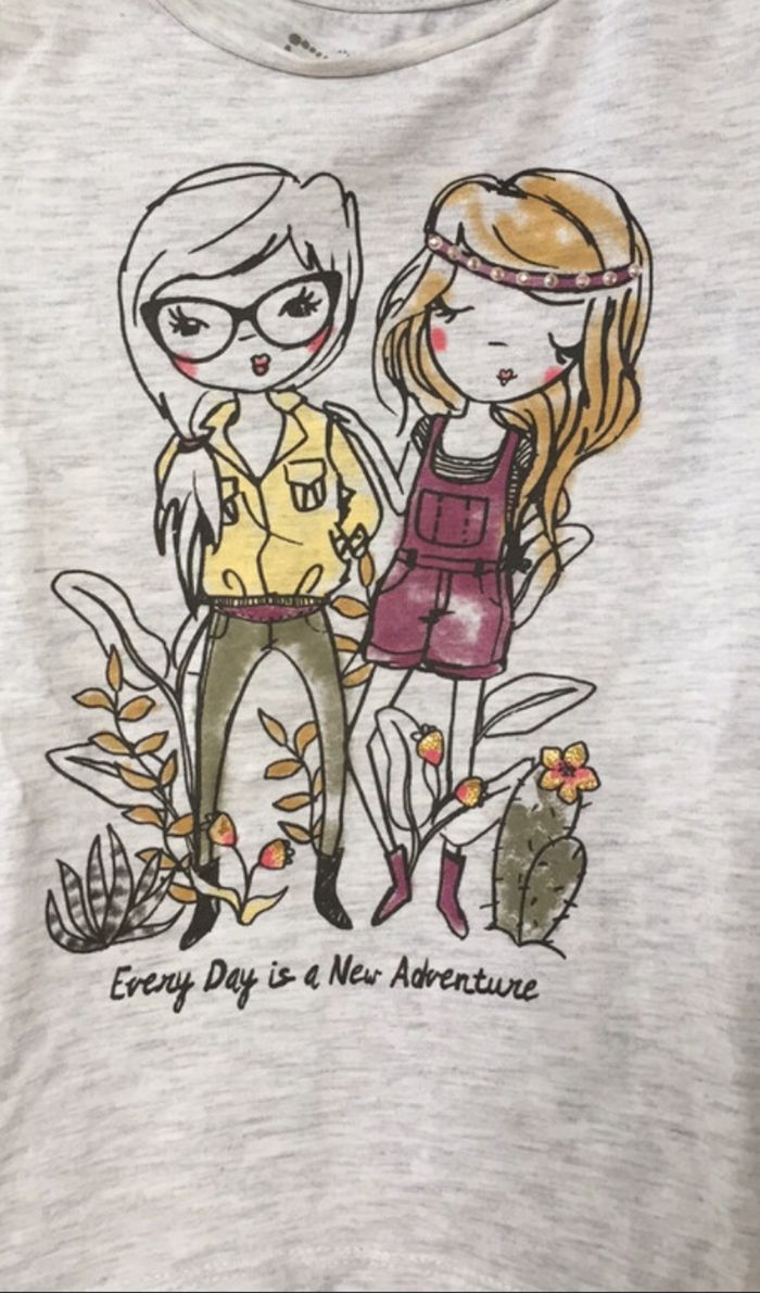 tee shirt fille avec dos original 4 ans - 104 cm très bon état, très peu porté dessin de deux petites filles « every day is a new adventure »