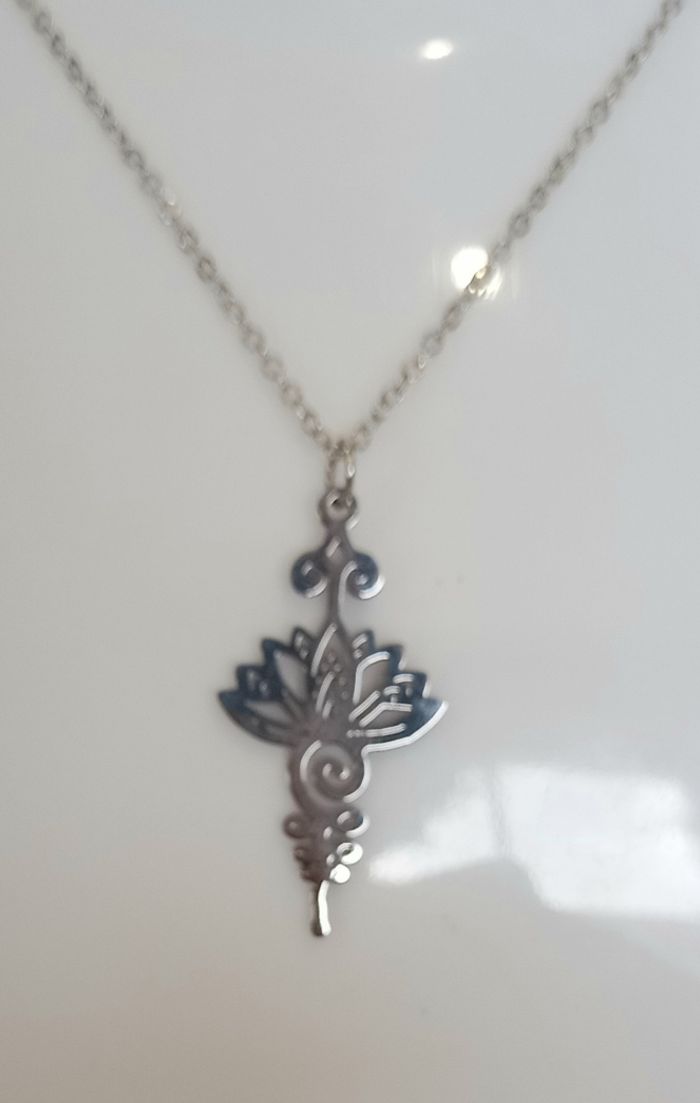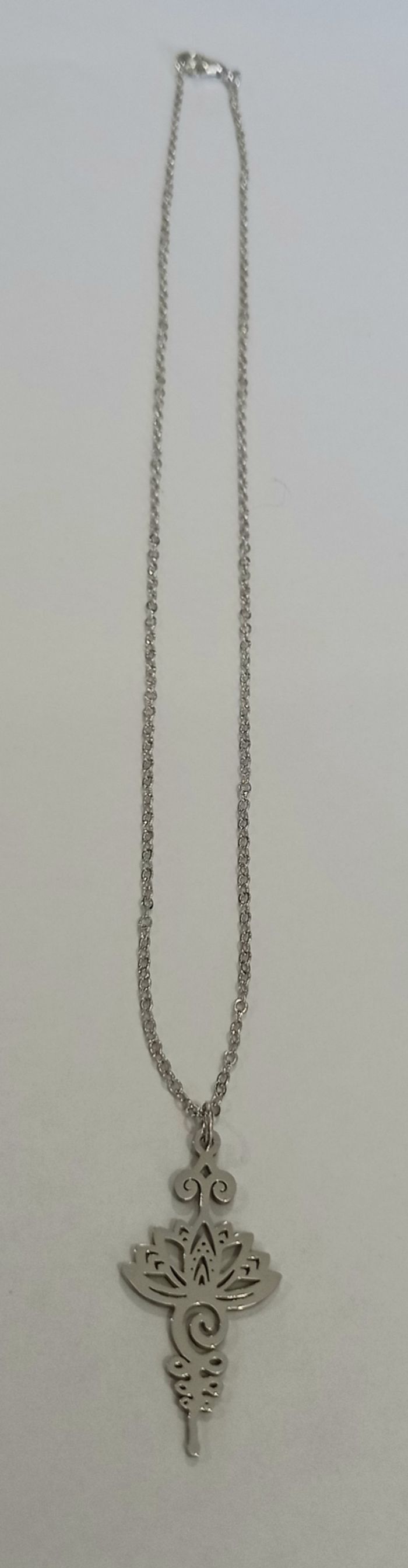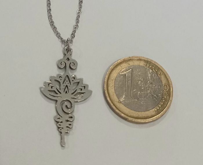 Chaine et pendentif coloris argenté. Inspiration zen. Longueur de la chaine : 40 cms. Dimensions du pendentif : 3,4 x 1,8 cms. Collier neuf sous blister. N'hésitez pas à regarder mes autres ventes. Envoi rapide et soigné.