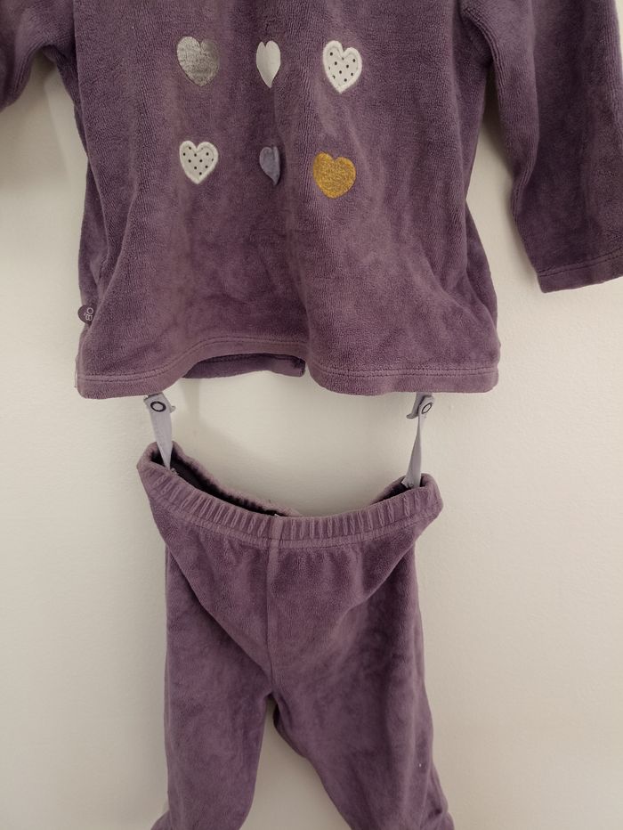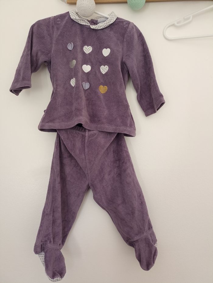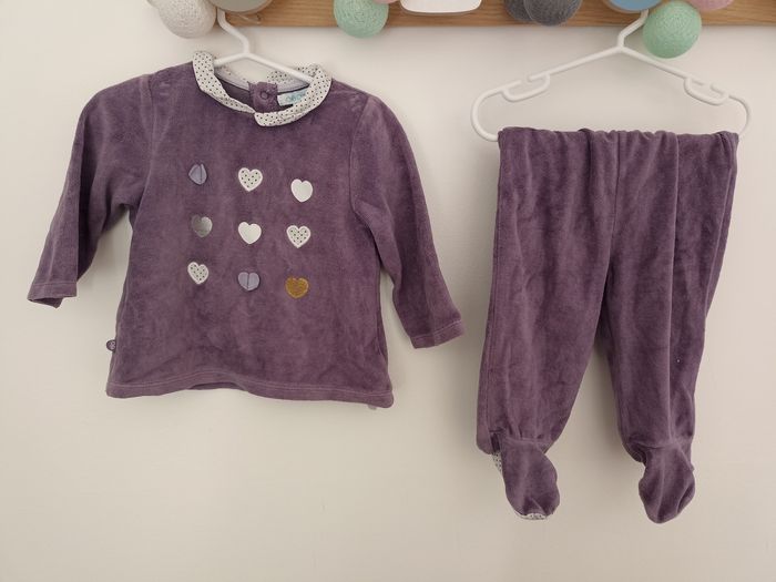 Pyjama 2 pièces en velours violet avec coeurs brodés ou imprimés Le haut est fermé par des pressions dans le dos, les 2 parties peuvent être liées entre elles par des liens à pressions (utiles en cas de bébé remuant dans son sommeil pour ne pas le retrouver sans le bas) Taille un peu plus grand (12 mois plutôt que 9)