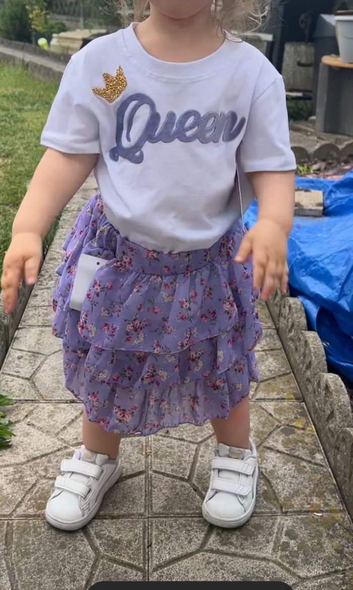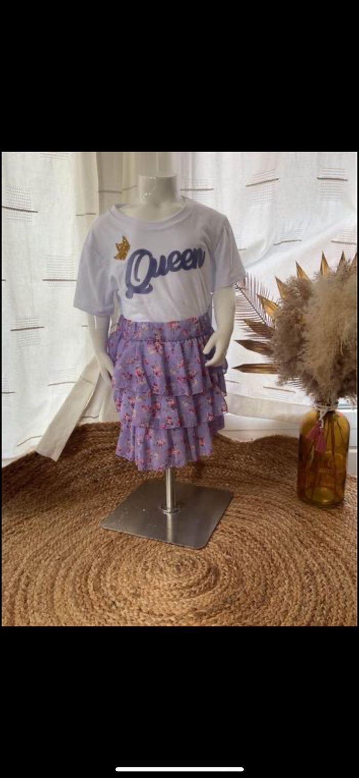 Magnifique ensemble parme Jupe et tee shirt peuvent se vendre séparément Taille : 4,6,8,10,12,14 ans aux choix selon l’es stock Jupe :11,50€ Tee-shirts 9,50€