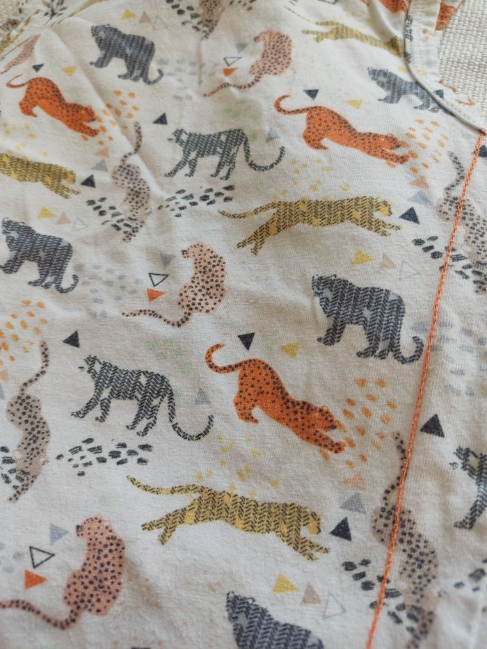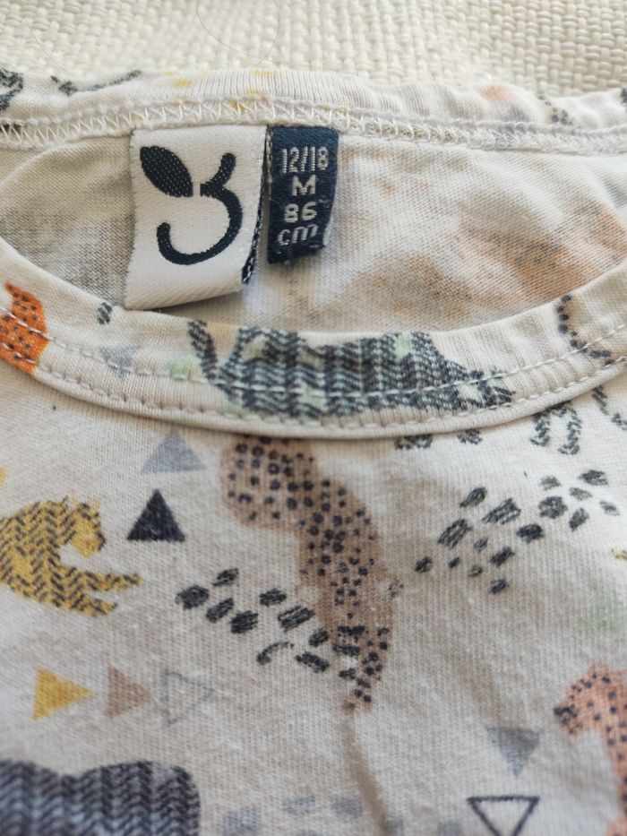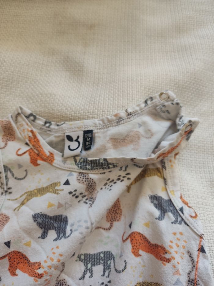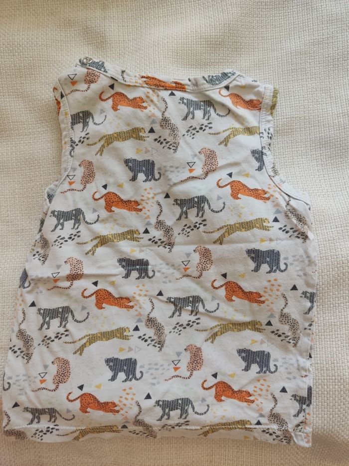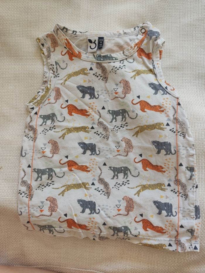 Vêtement d'été garçon, débardeur en coton marque 3 pommes, taille 12/18 mois - 86cm, couleur blanc, motif animaux. Bouton pression sur la bretelle gauche pour faciliter l'habillage. Très bon état