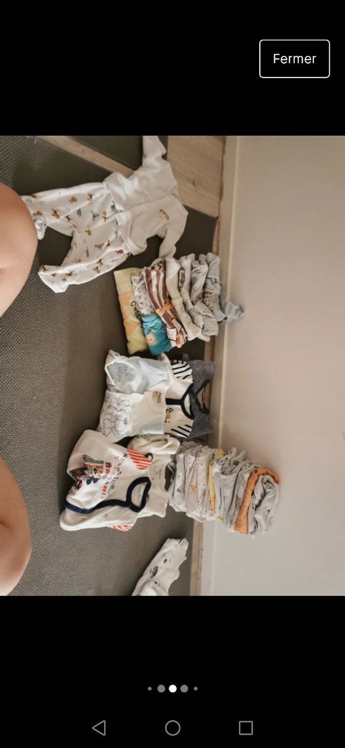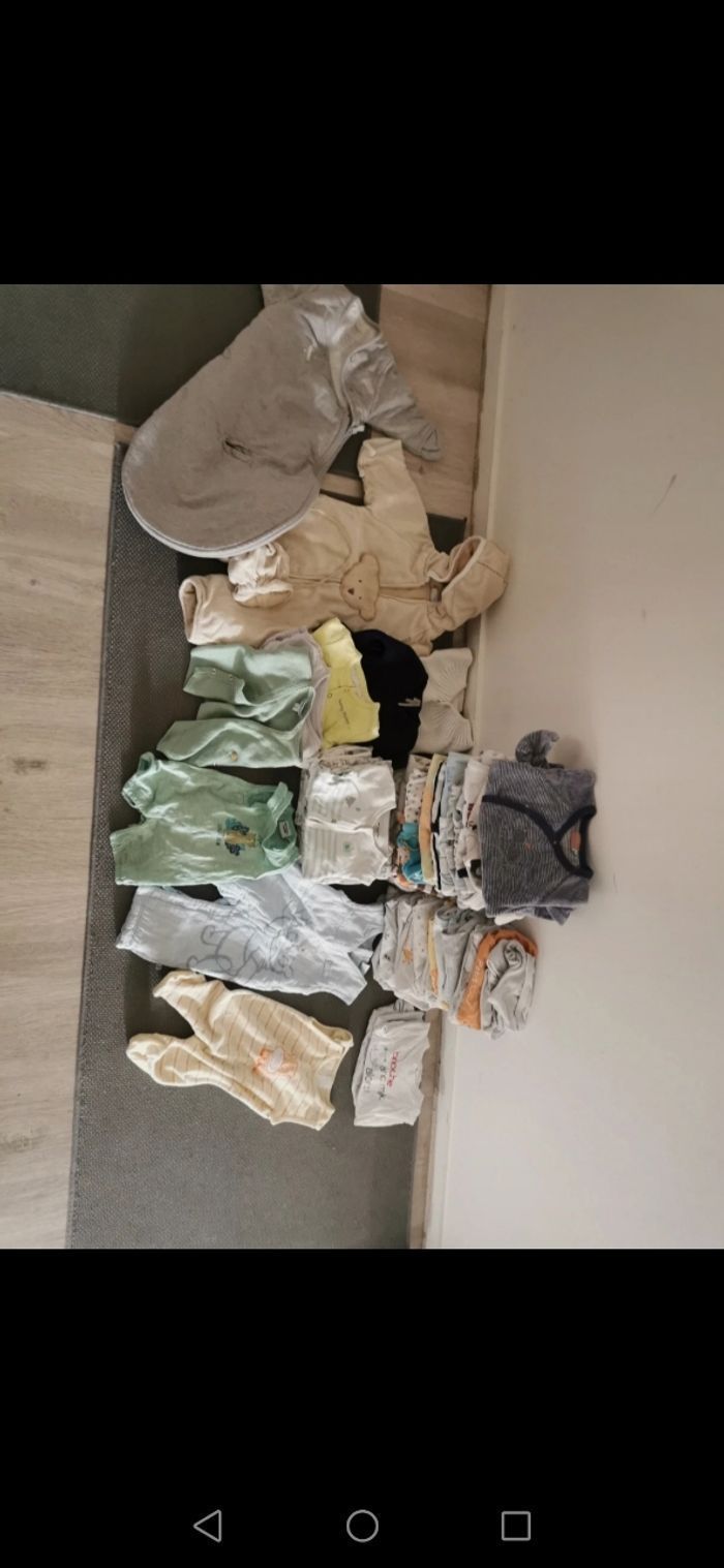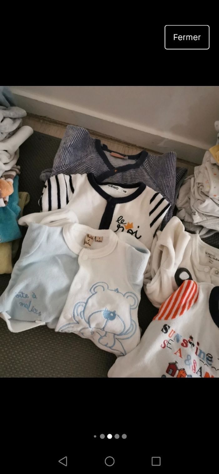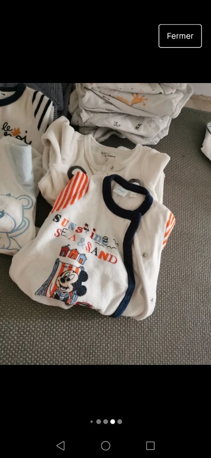 1mois,très bon état - 1pyjama 2 pieces -12 pyjamas Velour - 5 pyjamas coton - 20 bodies manches longues - 3 brassières coton - 2 gilets - 3 T-shirt manches longues - 1 salopette winnie - 1 salopette avec pied - 2 combi-pilote 50 articles de diverses marques (natalys, verbaudet, dpam, kiabi, disney...) en bon état voire très bon état car jamais portés