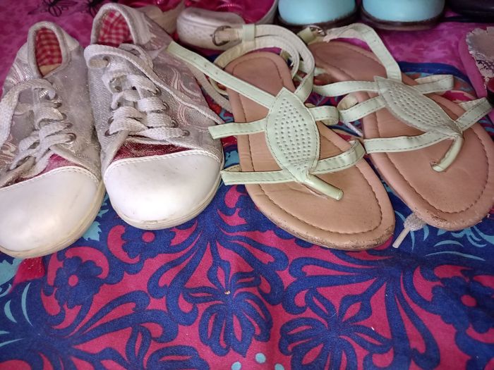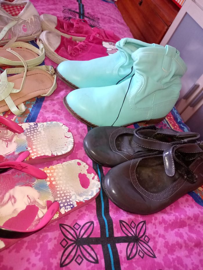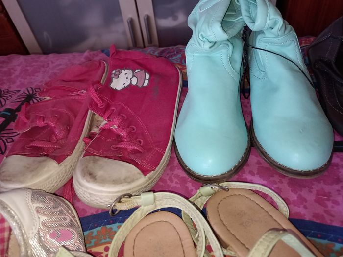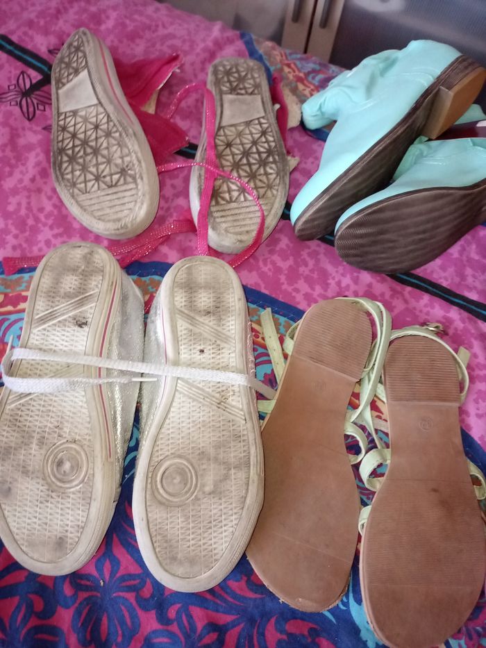 Chaussure, botte, soulier, tong p.32 Basket montante rose hello kitty bon état 6 euro Botte verte neuve 15€ Soulier grise bon état 10€ Basket grise bon état 7€ Sandales verte bon état 5€ Tong violetta bon état 3€