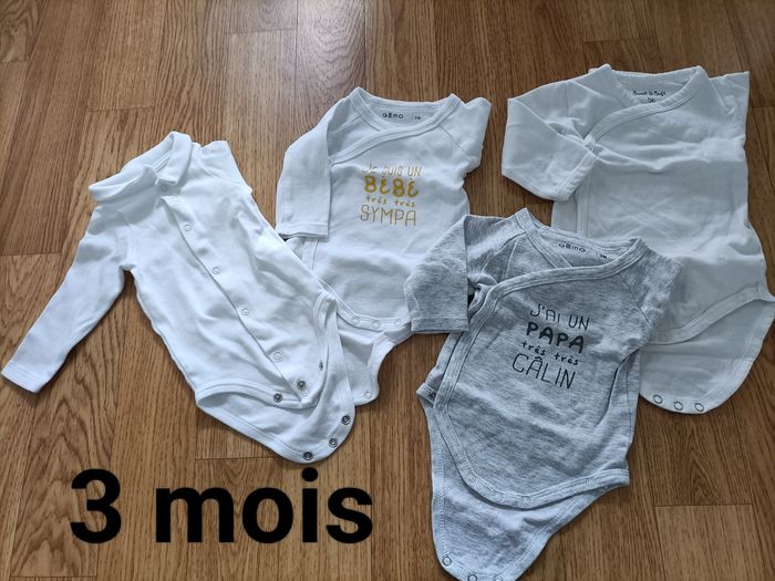 Lot de 4 bodies 3mois dont un body chemise, en excellent état, pas de trou ni de tâche. Boutonnage par le devant.