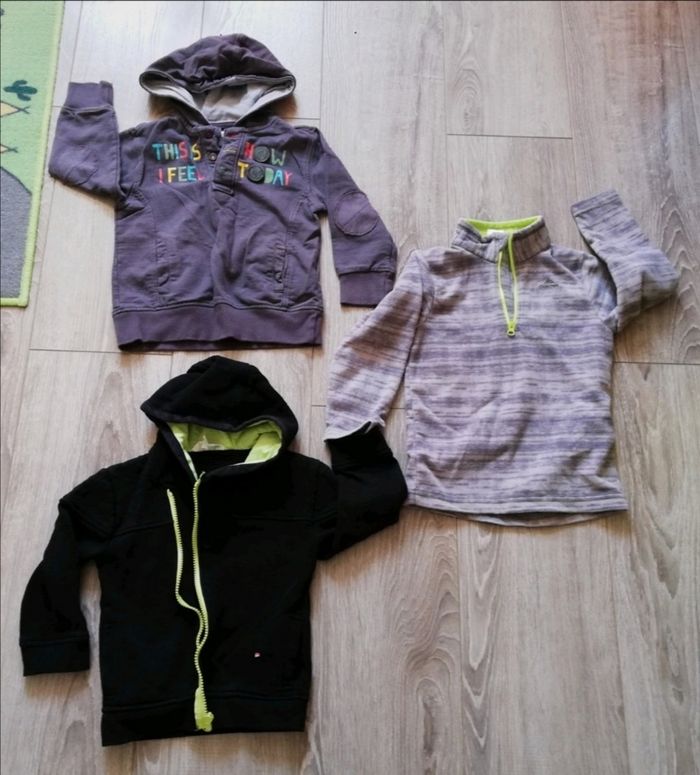 Je vends un lot de pulls et gilets en taille 4 ans: 1 sweat à capuche 1 pull 1 gilet à capuche zippé Vêtements portés plusieurs fois d'où leurs traces d'usure par endroit pour certains. N'hésitez pas à me demander si besoin d'autres infos ou photos. Je vends aussi d'autres vêtements pour garçon, dans mon dressing.