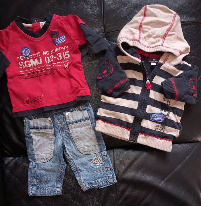 Ensemble 3 mois en TBE composé d'un jean tape à l'œil, d'un tee-shirt manches longues sergent major et d'un gilet chaud sergent major. Le tout sans tâches ni trous