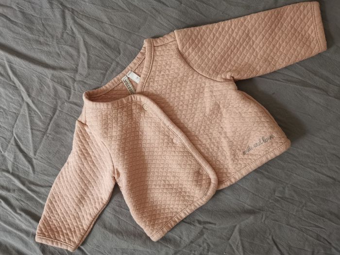 Lot bébé 1 mois comprenant 13 article diverses marques. 3 leggings zara et autres 1 pyjama chaud kiabi 4 hauts manches longues Kiabi 1 salopette obaibi 1 robe little natural 1 haut robe hetm 1 layette blanche coton orchestra 1 veste rose pale molletonnée orchestra