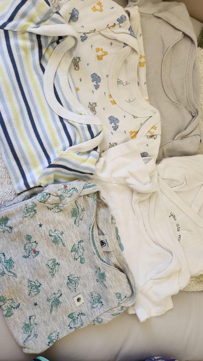 Tout très peu porté sauf quelques bodys d'un lot d'occasion qui sont tout de même en bon état et sans tâches.