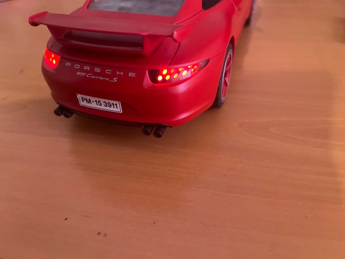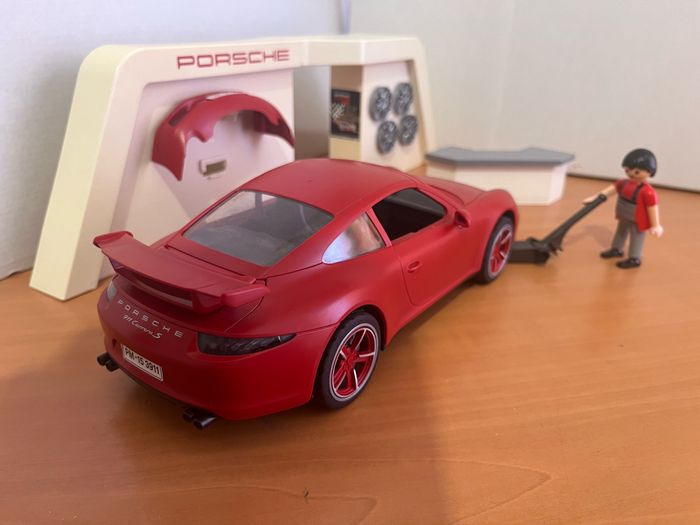 Garage Porsche Playmobil, la voiture nécessite trois piles AAA et les phares avant, arrière ainsi que l’intérieur peuvent s’allumer. Attention il manque un rétroviseur et le plastique blanc du garage a un peu jauni. La voiture est en très bon état sinon