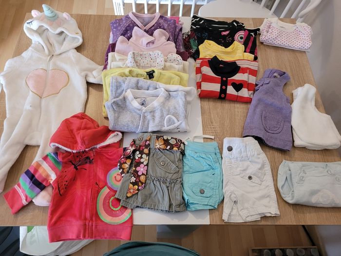 Lot 3 mois Comprend: - 2 gilets - 1 pull - 1 robe - 2 bas - 1 jupe - 2 boddy - 4 hauts - 6 pyjama - 1 pyjama licorne avec capuche Bon état