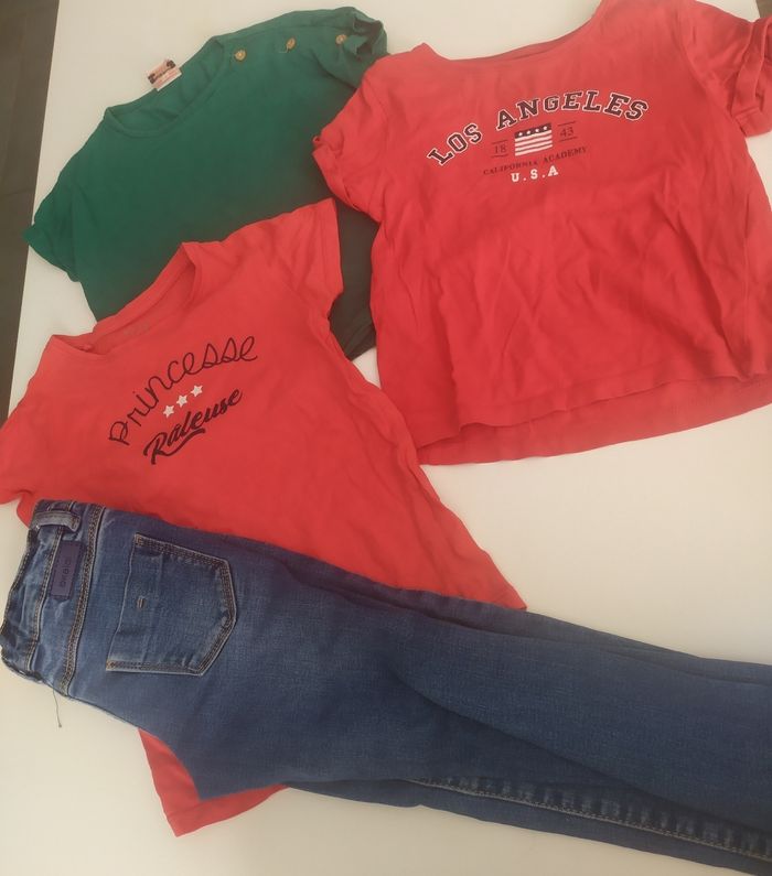Lot 5ans fille composé de : _ 1 tee shirt vert Tape à l'oeil _1 tee shirt rouge Kiabi _1 tee shirt rouge Charlie Prune _1 jean skinny Okaïdi Le tout en très bon état