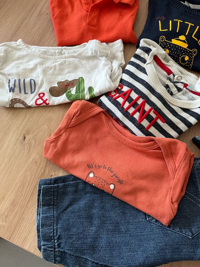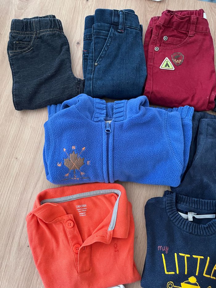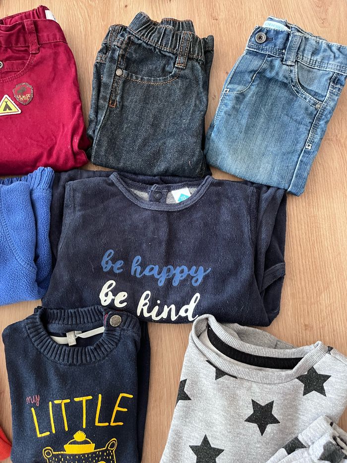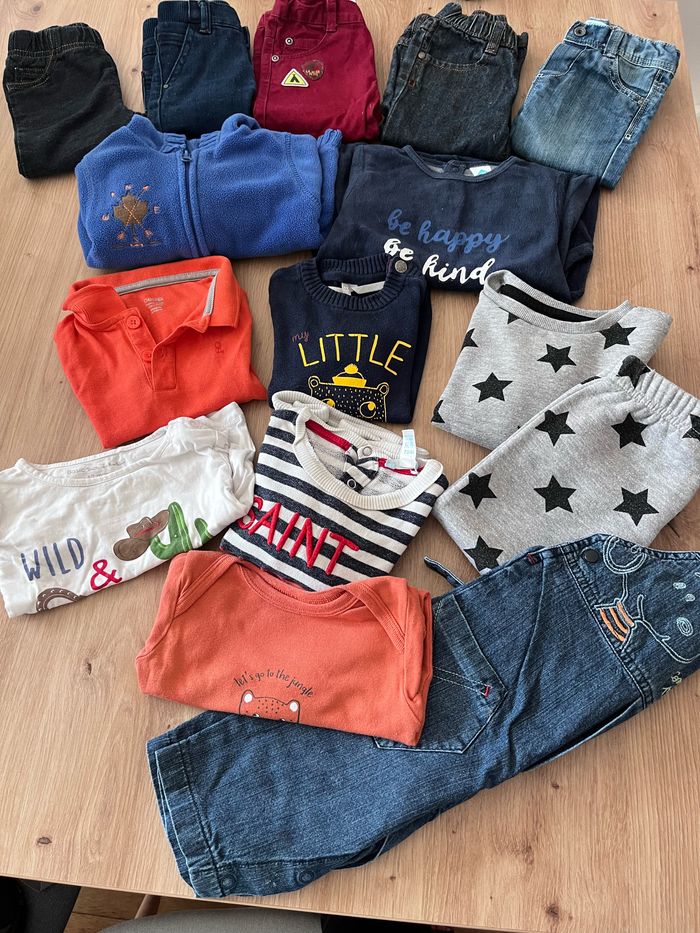 5 jeans 1 pyjama 1 pièce 1 polaire à capuche 2 pulls 1 polo manches courtes 1 t shirt manches longues 1 bodies manches longues 1 ensemble survêtement 1 salopette pantalon en jeans