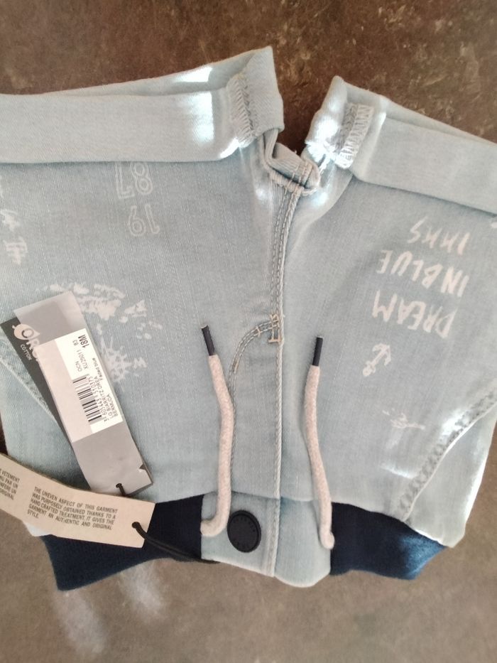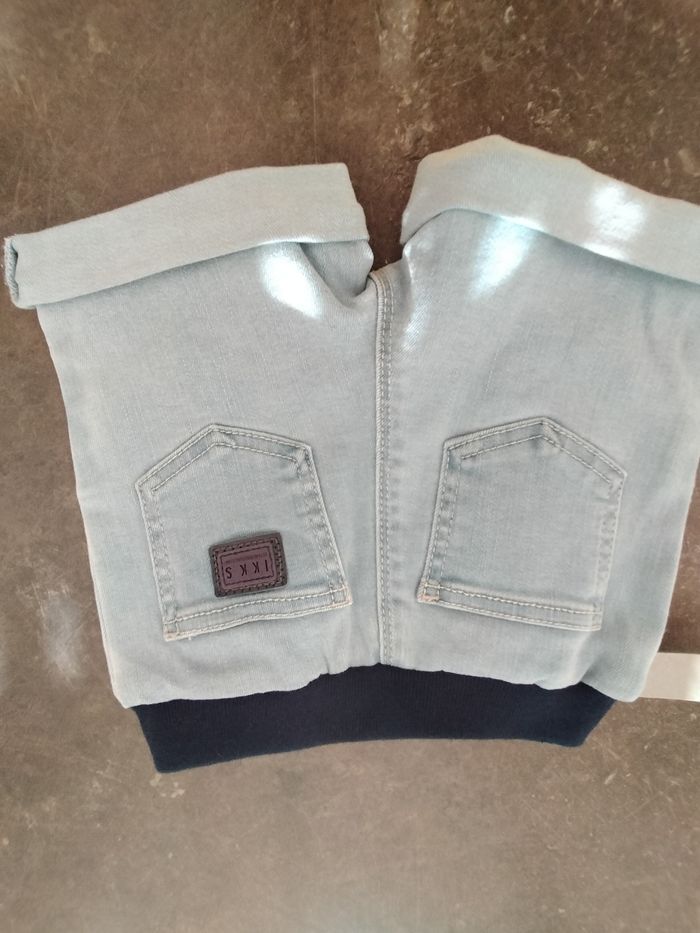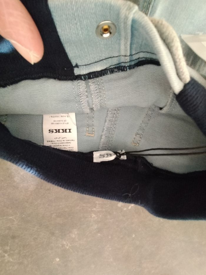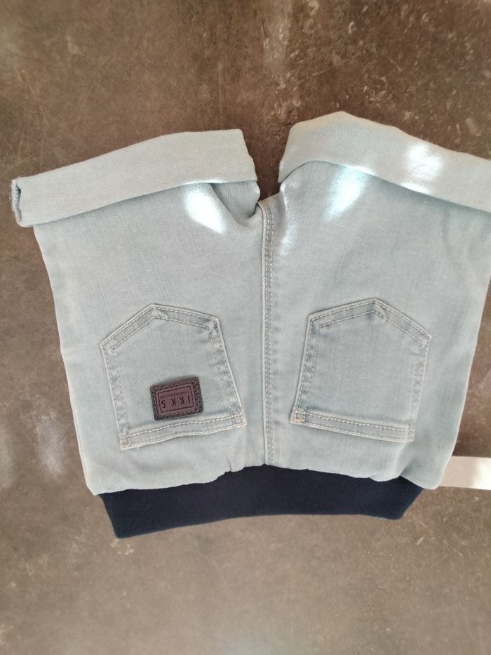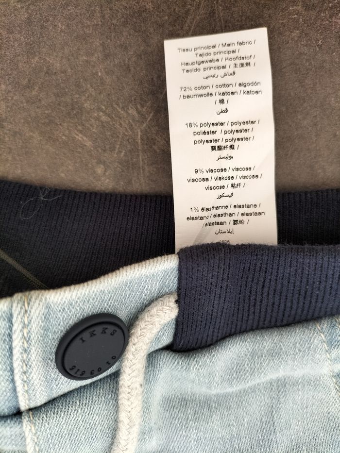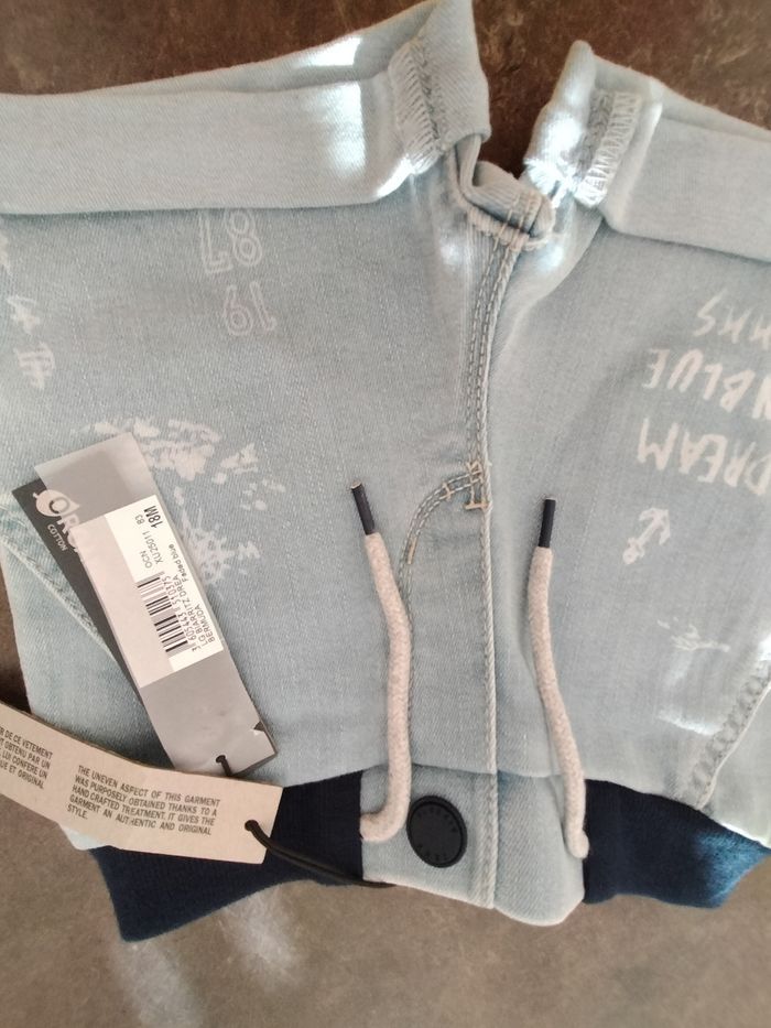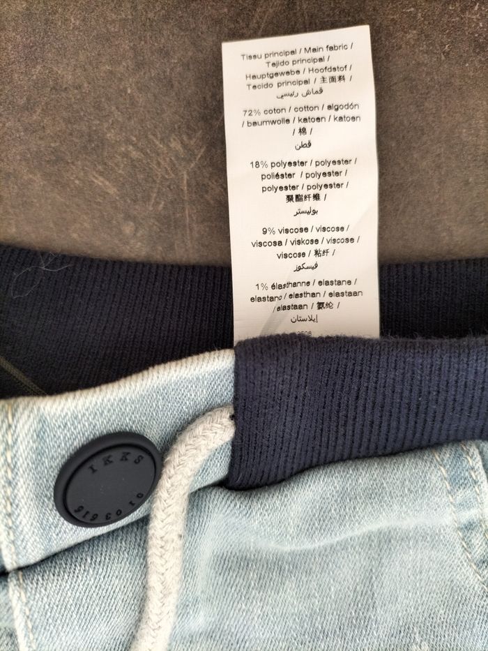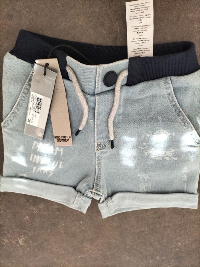 Short en jean bleu clair très souple en 18 mois garçon , taille élastiquée et liens. Ikks . Avec son étiquette d'achat.