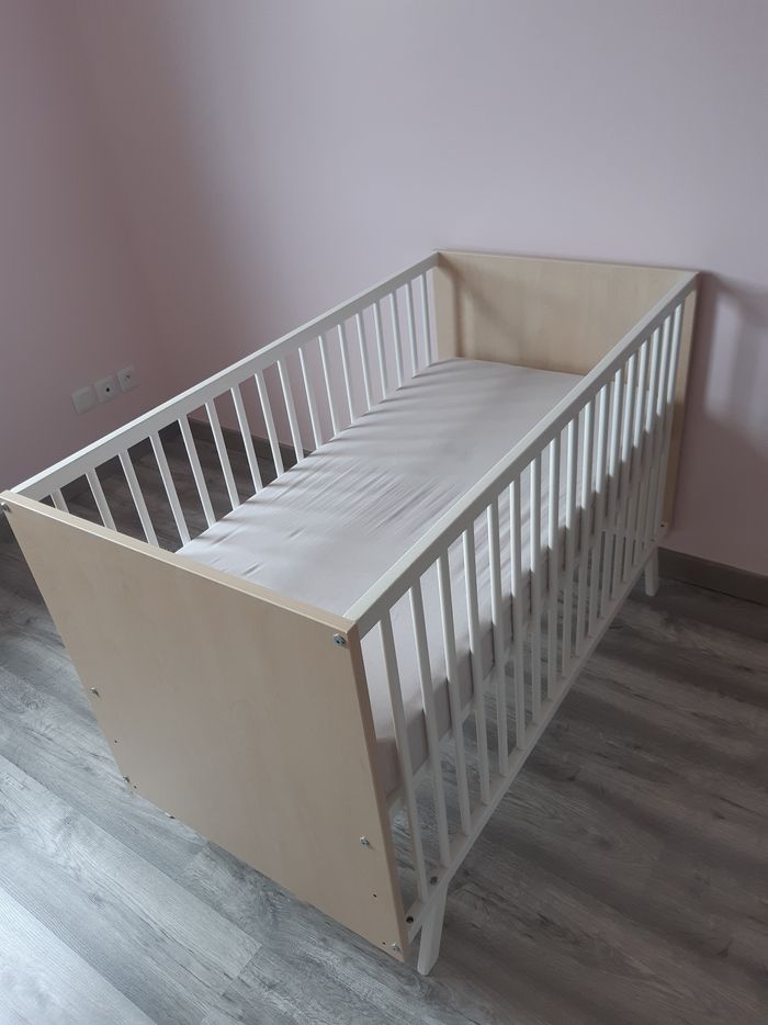 Lit barreaux bébé blanc et chêne claire Réglable sur 3 étages 60 x 120cm Commode blanc et chêne clair qui fait table à langer. Acheté chez conforama pour 350 euros Matelas 60x120cm marque Aubert 175 euros. Ensemble avec Matelas 250 euros Sans Matelas 200 euros Matelas seul 80 euros