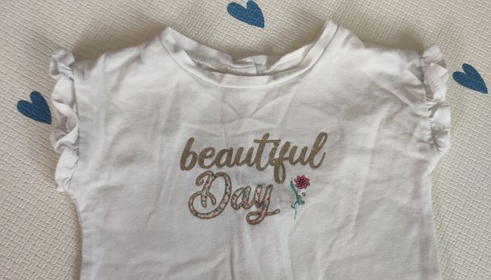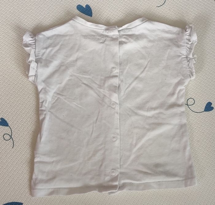 T-shirt blanc, sans manche, à volants Écriture dorée sur le torse En très bon état, très peu porté Taille 6 mois de chez Vertbaudet