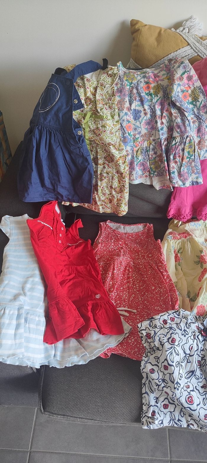 14 robes, 1 maillot bain, 2 paires sandales pointure 25-27, 9 paires chaussettes, 2 gilets, 3 bodies, 5 hauts, 1 combi, 1 short.