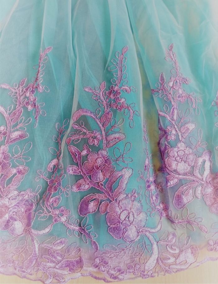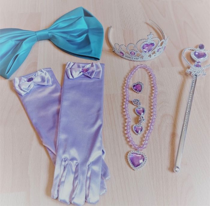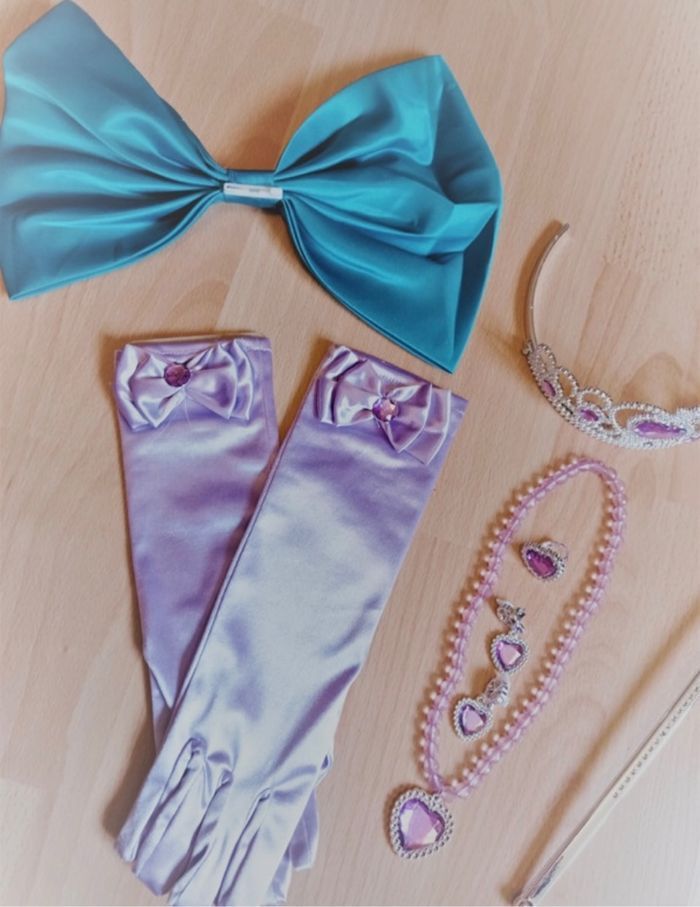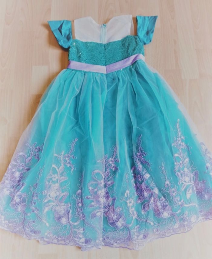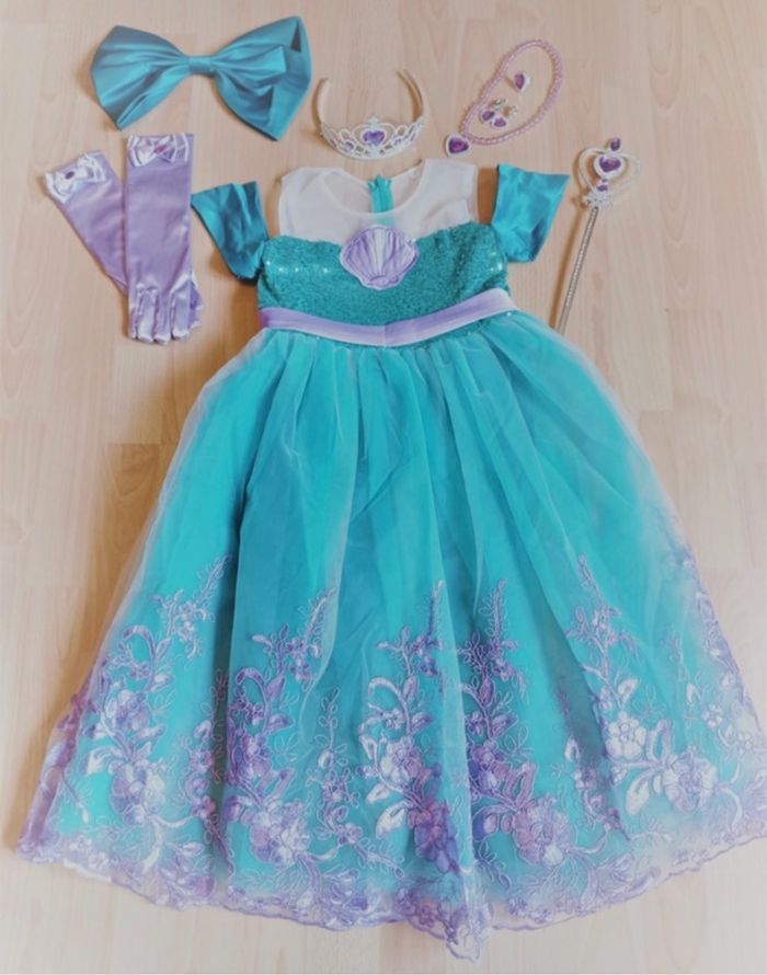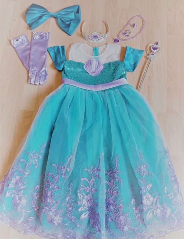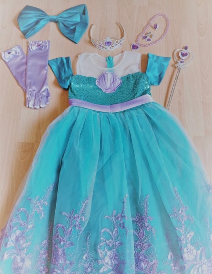 Déguisement robe sirène turquoise et violette et ces accessoires (couronne, baguette, gants, noeud). La robe mesure 80cm de longueur, la taille convient aux petites filles de 4-5ans. Totalement neuve, vendue dans son emballage d’origine. Expédition rapide après votre commande
